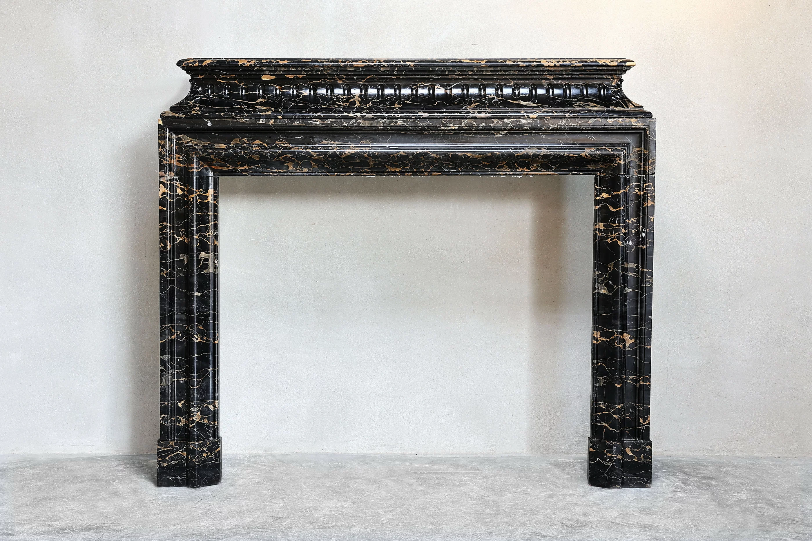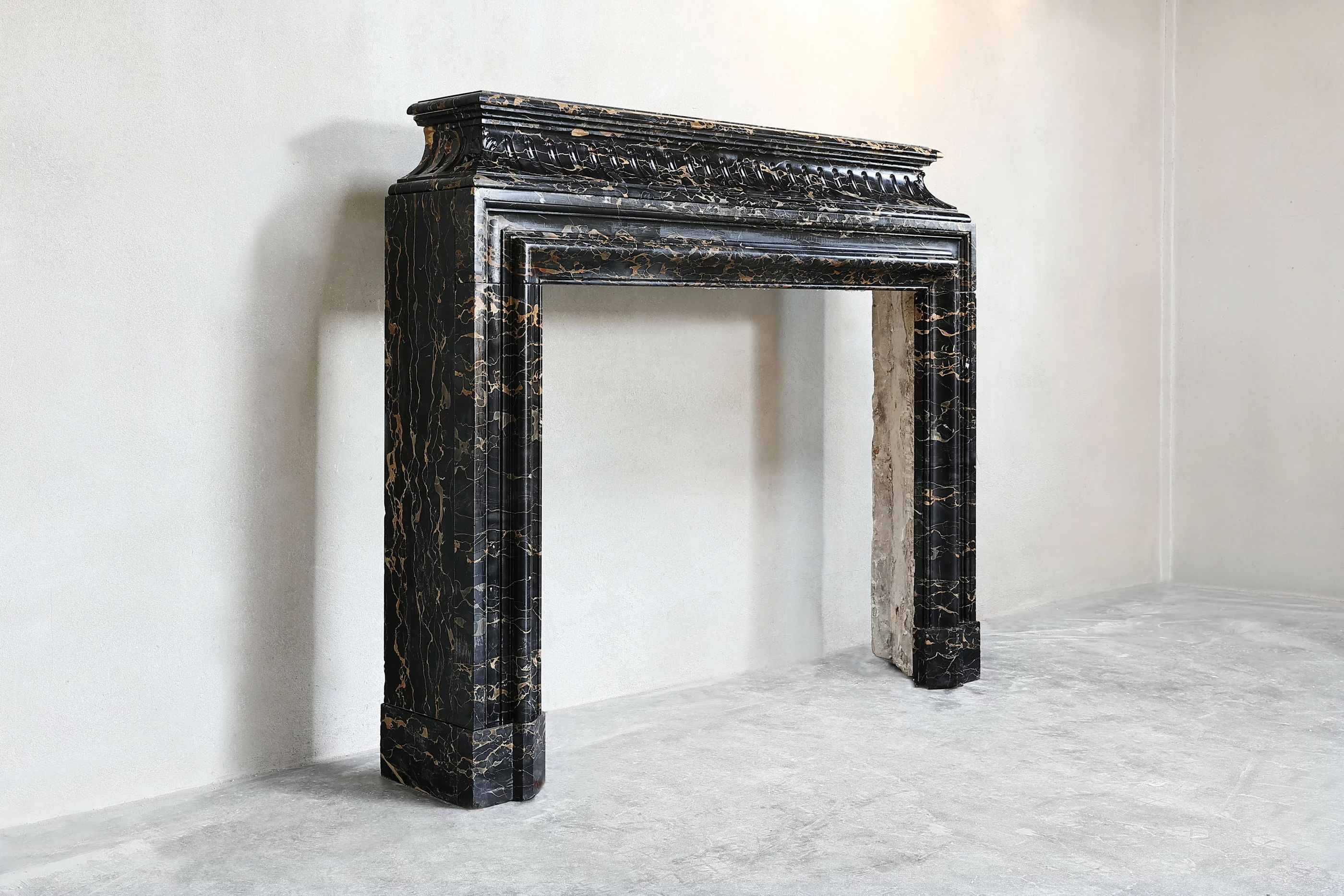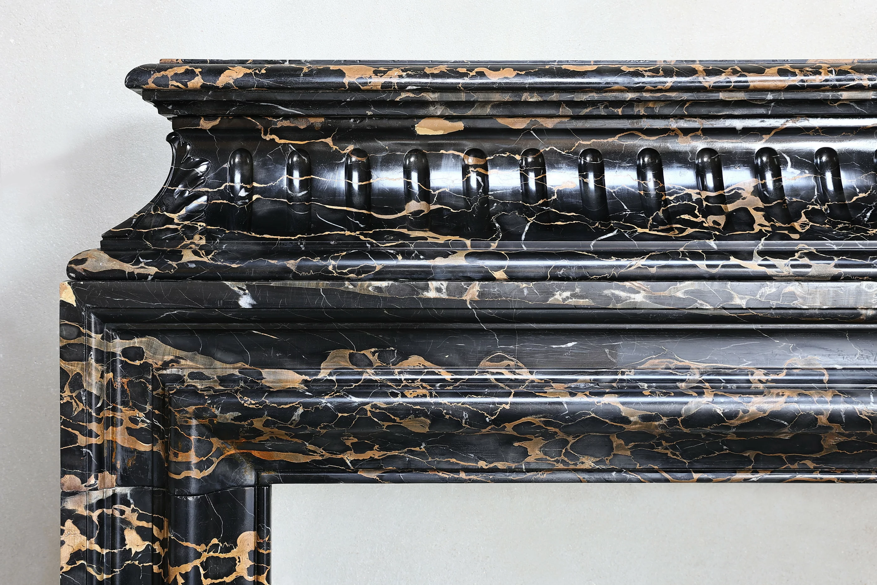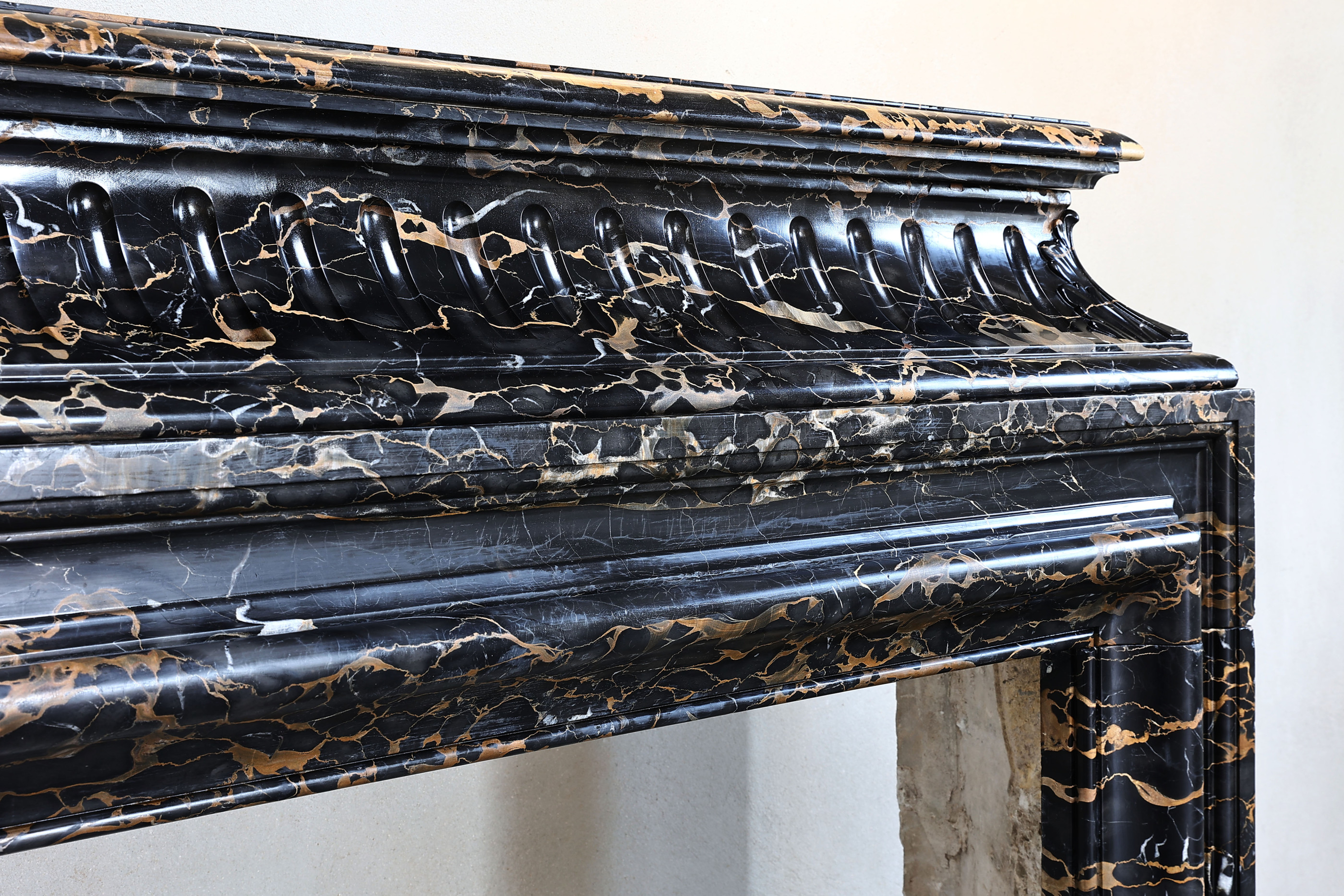 Prachtige unieke schouw van Portoro marmer. Portoro marmer heeft z'n oorsprong in Italië en is een hele mooie warme marmersoort van donkerbruin/zwart met prachtige gevlamde aders! Deze antieke schouw stamt uit de 19e eeuw en is in stijl van Louis XIII. Een zeer mooie schouw met cannelures in het frontgedeelte en mooie belijningen.