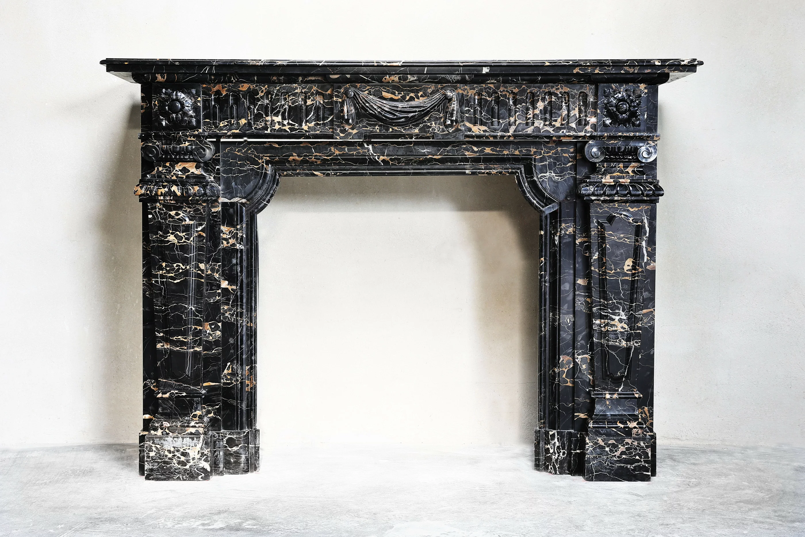 Zeer bijzondere exclusieve schouw van Portoro marmer uit het einde 19e eeuw. Deze antieke mantel is in stijl van Louis XVI en bijzonder gedecoreerd met diverse ornamenten en versieringen. Uniek om te melden is dat deze schouw gesigneerd is door de steenkapper 'Jozef'. De warme kleurstelling en de decoraties + signering maken deze schouw tot een prachtig geheel.
