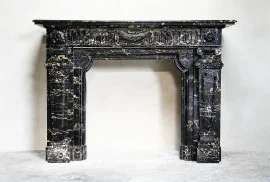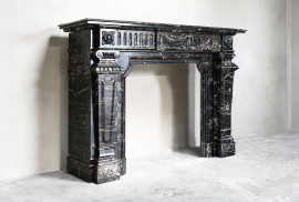 Zeer bijzondere exclusieve schouw van Portoro marmer uit het einde 19e eeuw. Deze antieke mantel is in stijl van Louis XVI en bijzonder gedecoreerd met diverse ornamenten en versieringen. Uniek om te melden is dat deze schouw gesigneerd is door de steenkapper 'Jozef'. De warme kleurstelling en de decoraties + signering maken deze schouw tot een prachtig geheel.