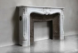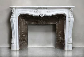 Prachtige antieke witte Carrara marmeren schouw uit de 19e eeuw in stijl van Louis XV. Rijk gedecoreerd met 'trois coquilles' in het midden van het frontgedeelte en op de benen! De gietijzeren insert is een perfecte toevoeging en maakt de schouw nog meer bijzonder!