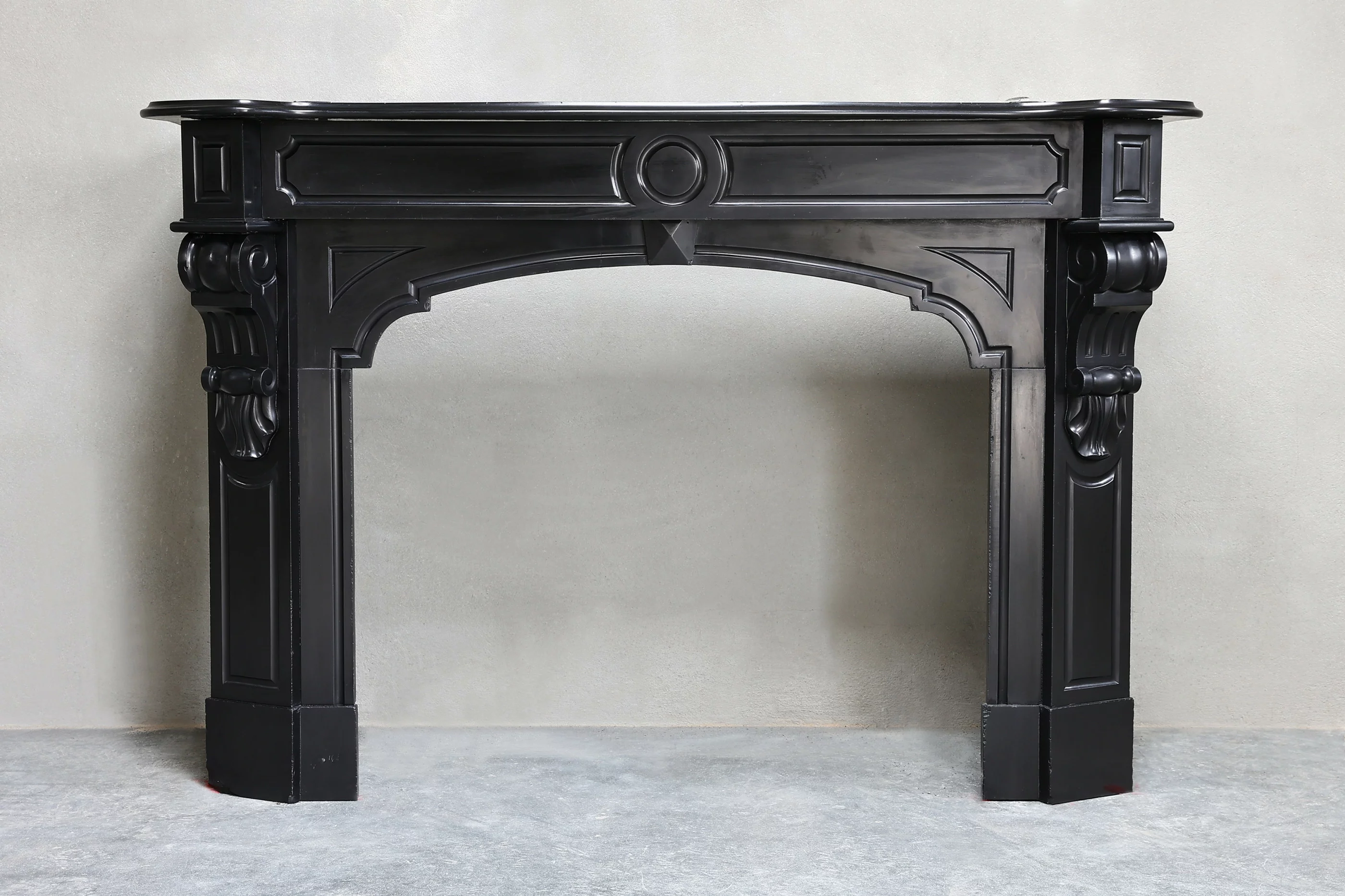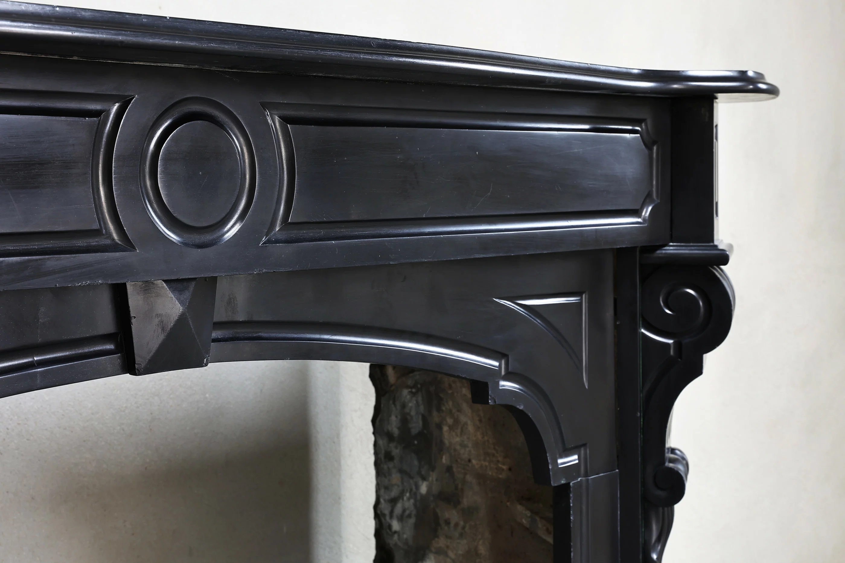 Hele chique antieke schouw van Noir de Mazy marmer uit de 19e eeuw! De prachtige mantel heeft mooie ornamenten in het frontgedeelte en op de benen. Een mooie decoratieve open haard die prachtige staat in een klassiek of modern interieur!