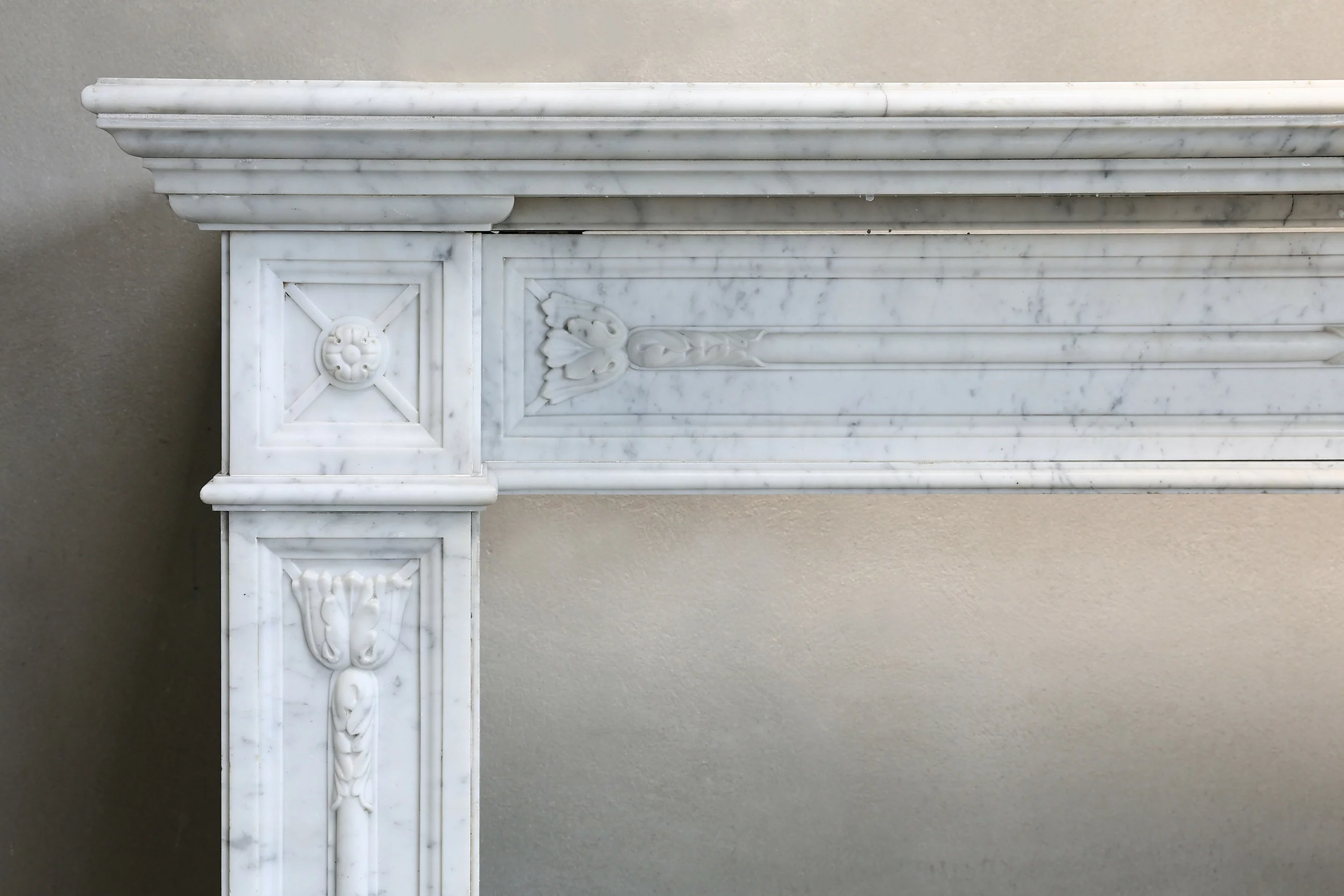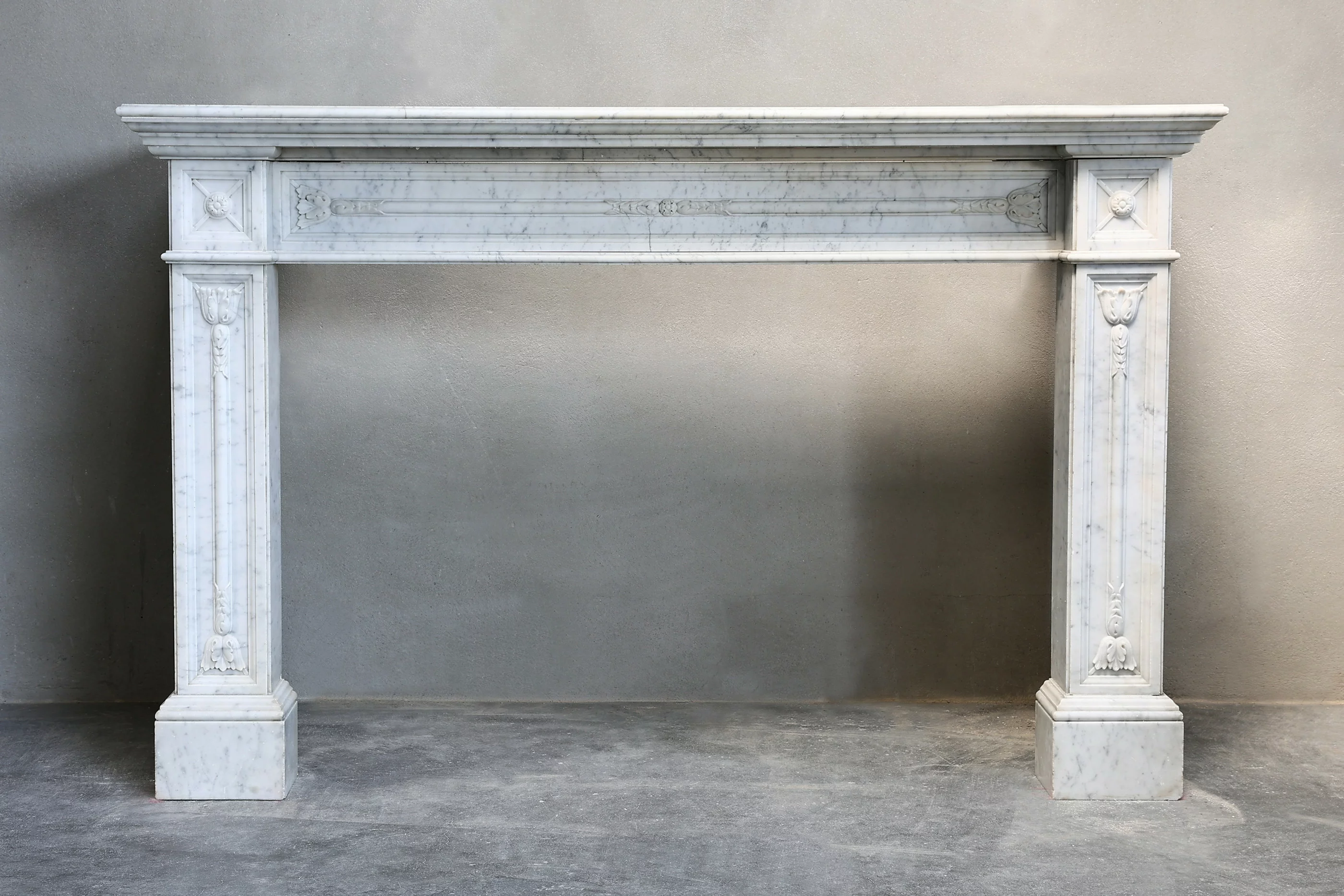 Antieke open haard van Arabescato marmer uit de 19e eeuw in de stijl van Louis XVI. Deze schouw stamt uit de 19e eeuw en heeft mooie ornamenten in het bovenblad en op de benen. Een mooie rechte chimney die past in diverse interieur stijlen! Er heeft een scheurtje gezeten in het blad, maar dit is deskundig hersteld.