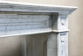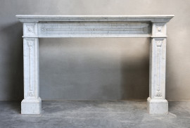 Antieke open haard van Arabescato marmer uit de 19e eeuw in de stijl van Louis XVI. Deze schouw stamt uit de 19e eeuw en heeft mooie ornamenten in het bovenblad en op de benen. Een mooie rechte chimney die past in diverse interieur stijlen! Er heeft een scheurtje gezeten in het blad, maar dit is deskundig hersteld.