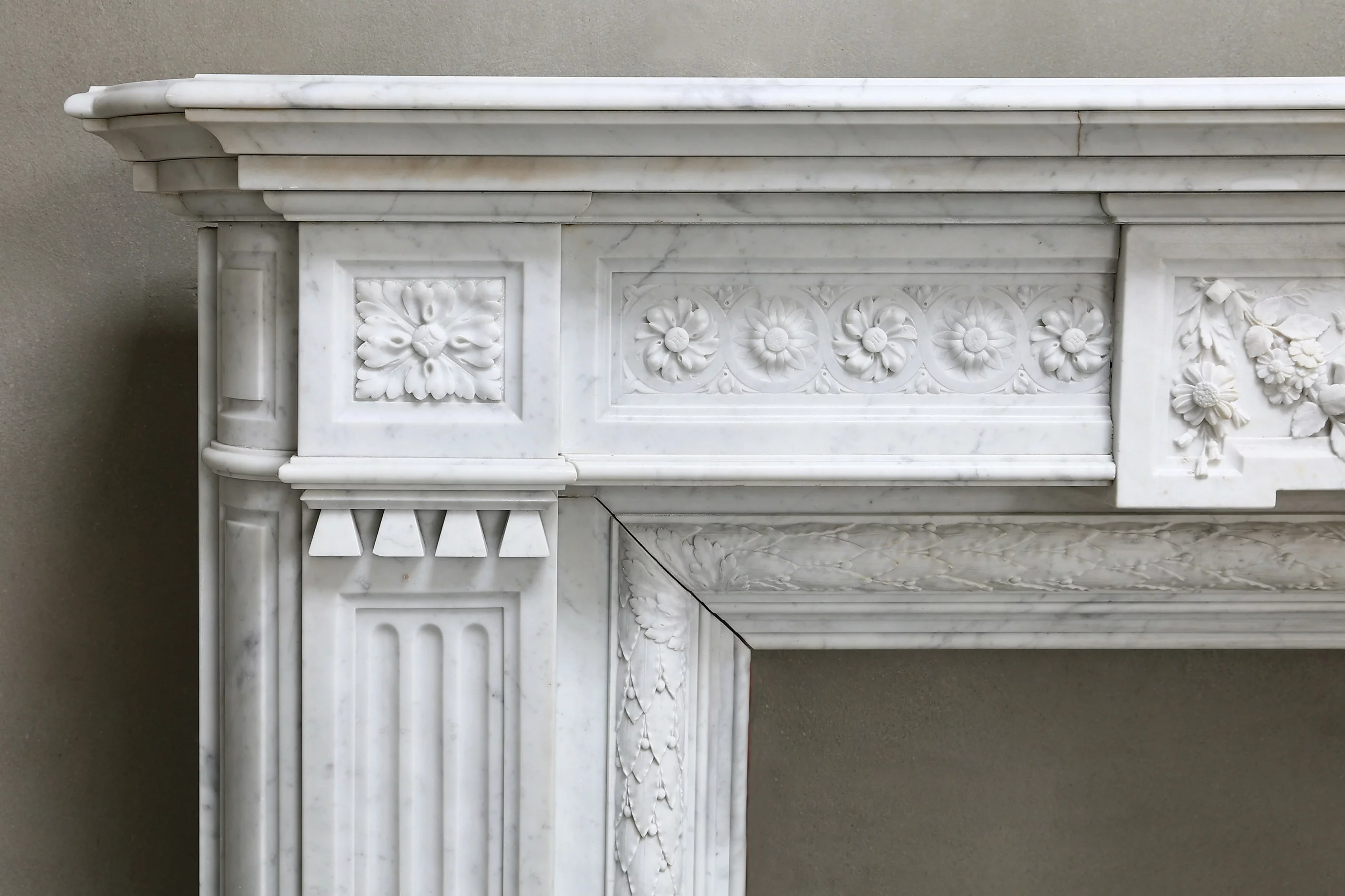 Een zeer chique gedecoreerde schouw van Carrara marmer uit Italië. Deze antieke schouw stamt uit 1860 - 1880 en is in stijl van Louis XVI, rijkelijk versierd met ornamenten en cannelures op de benen. Een open haard die ook qua formaat aanwezig is, de breedte is maar liefst 182 cm, wat bijzonder is voor marmeren schouwen!