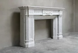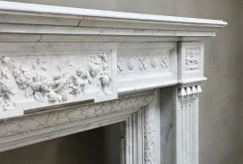Een zeer chique gedecoreerde schouw van Carrara marmer uit Italië. Deze antieke schouw stamt uit 1860 - 1880 en is in stijl van Louis XVI, rijkelijk versierd met ornamenten en cannelures op de benen. Een open haard die ook qua formaat aanwezig is, de breedte is maar liefst 182 cm, wat bijzonder is voor marmeren schouwen!