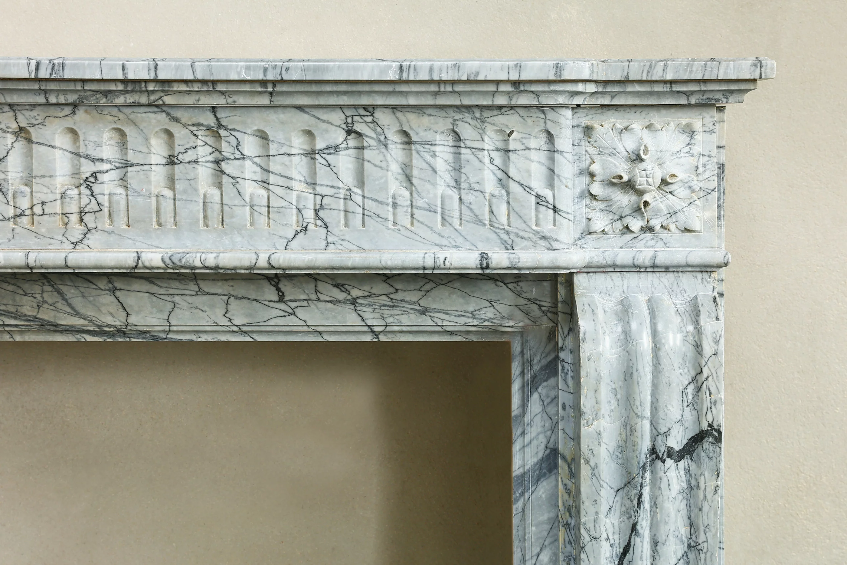 Een mooie schouw van Blue Fleuri marmer uit de 19e eeuw in stijl van Louis XVI. Een recht model met veel cannelures in het frontgedeelte en doorlopend op de benen! Ook de maatvoering is perfect in verhouding en past zowel in een strak, modern of nieuw landelijk interieur!