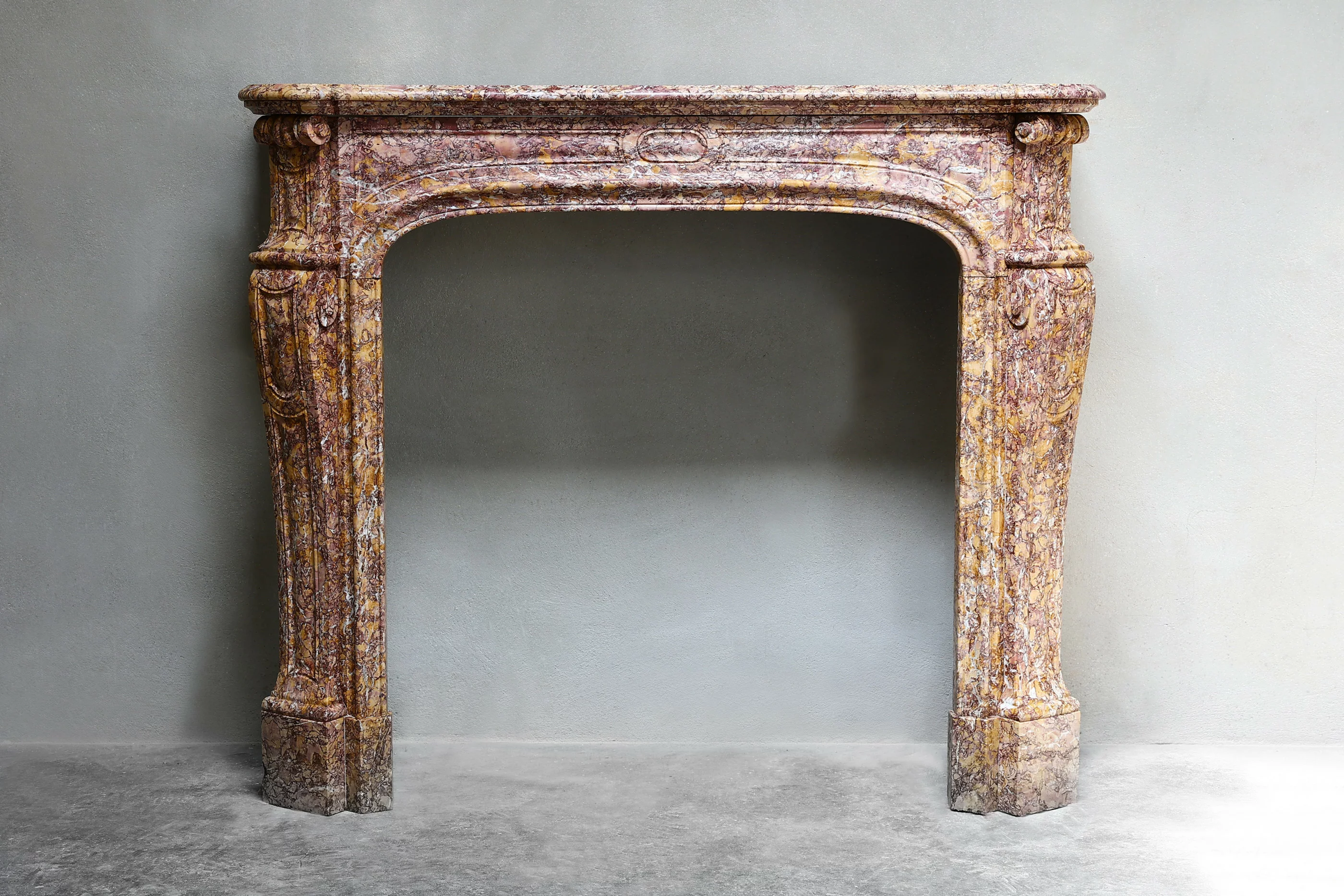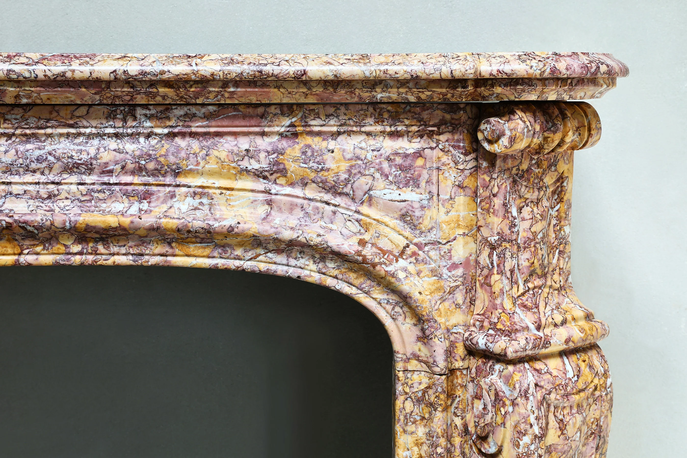 Ontdek deze elegante 19e-eeuwse Pompadour-stijl marmeren schouw in Brocatelle Violetta du Jura uit Parijs. Dankzij het verfijnde ontwerp en de rijke violetkleuren is dit een statementstuk voor verfijnde interieurs.