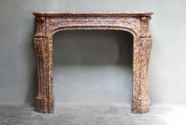 Deze schouw, vervaardigd rond 1860–1880, belichaamt de Pompadour-stijl – een revivalstijl die gekenmerkt wordt door elegante details en vloeiende vormen. Het gebruik van Brocatelle Violetta du Jura-marmer voegt visuele rijkdom toe dankzij de warme violettonen, wat getuigt van vakmanschap en esthetische voorkeuren in de hogere kringen van die tijd.