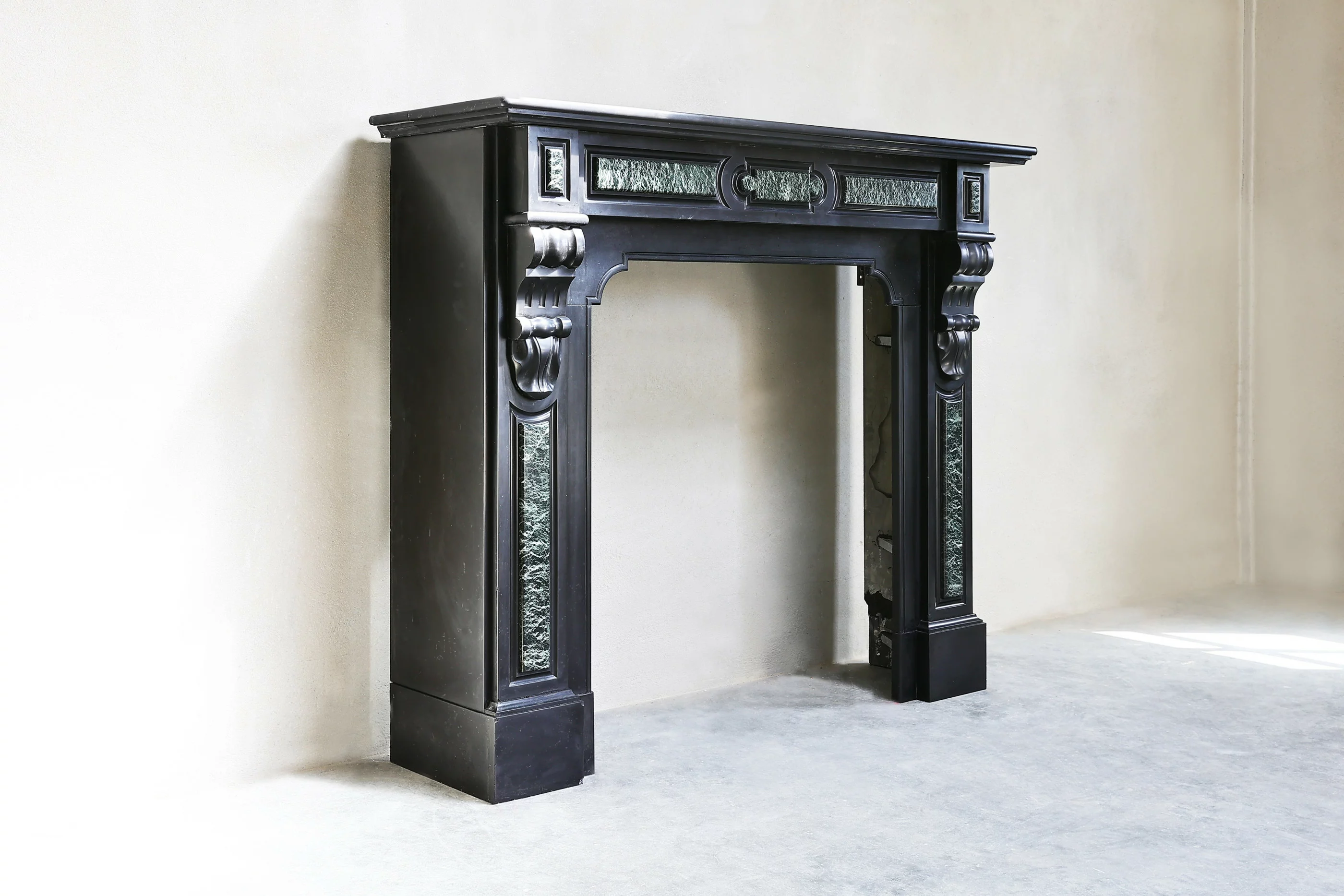 Antieke marmeren schouw van Noir de mazy marmer en groene marmer. Een compacte mantel uit de 19e eeuw met mooie versieringen en ornamenten in stijl van Louis XVI.