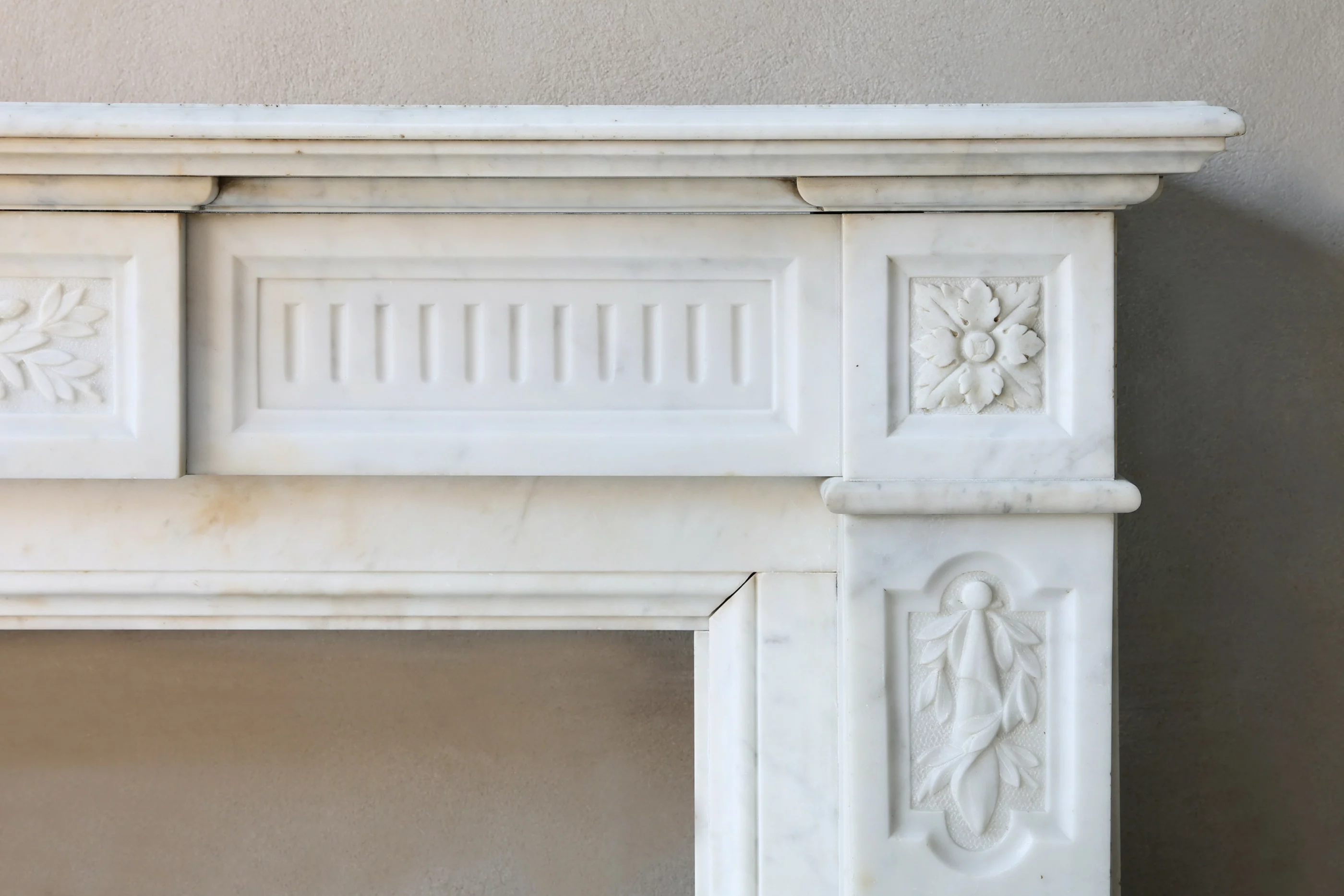 Zeer mooie antieke schouw die rijkelijk voorzien is van sierelementen en daardoor een elegante uitstraling heeft. Deze Carrara marmeren mantel stamt uit de 19e eeuw en is in stijl van Louis XVI. Een rechte schouw met diverse ornamenten in het frontgedeelte en op de benen.