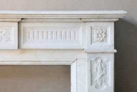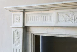 Zeer mooie antieke schouw die rijkelijk voorzien is van sierelementen en daardoor een elegante uitstraling heeft. Deze Carrara marmeren mantel stamt uit de 19e eeuw en is in stijl van Louis XVI. Een rechte schouw met diverse ornamenten in het frontgedeelte en op de benen.