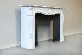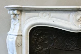 Prachtige antieke mantel van Carrara marmer in stijl van Louis XV uit de 19e eeuw. Deze schouw heeft een mooie passende insert van gietijzer, dat maakt de schouw compleet en bijzonder! Deze sierlijke schouw heeft een elegante schelp in het midden en aan beide zijkanten van de benen! Een zeer mooie open haard!