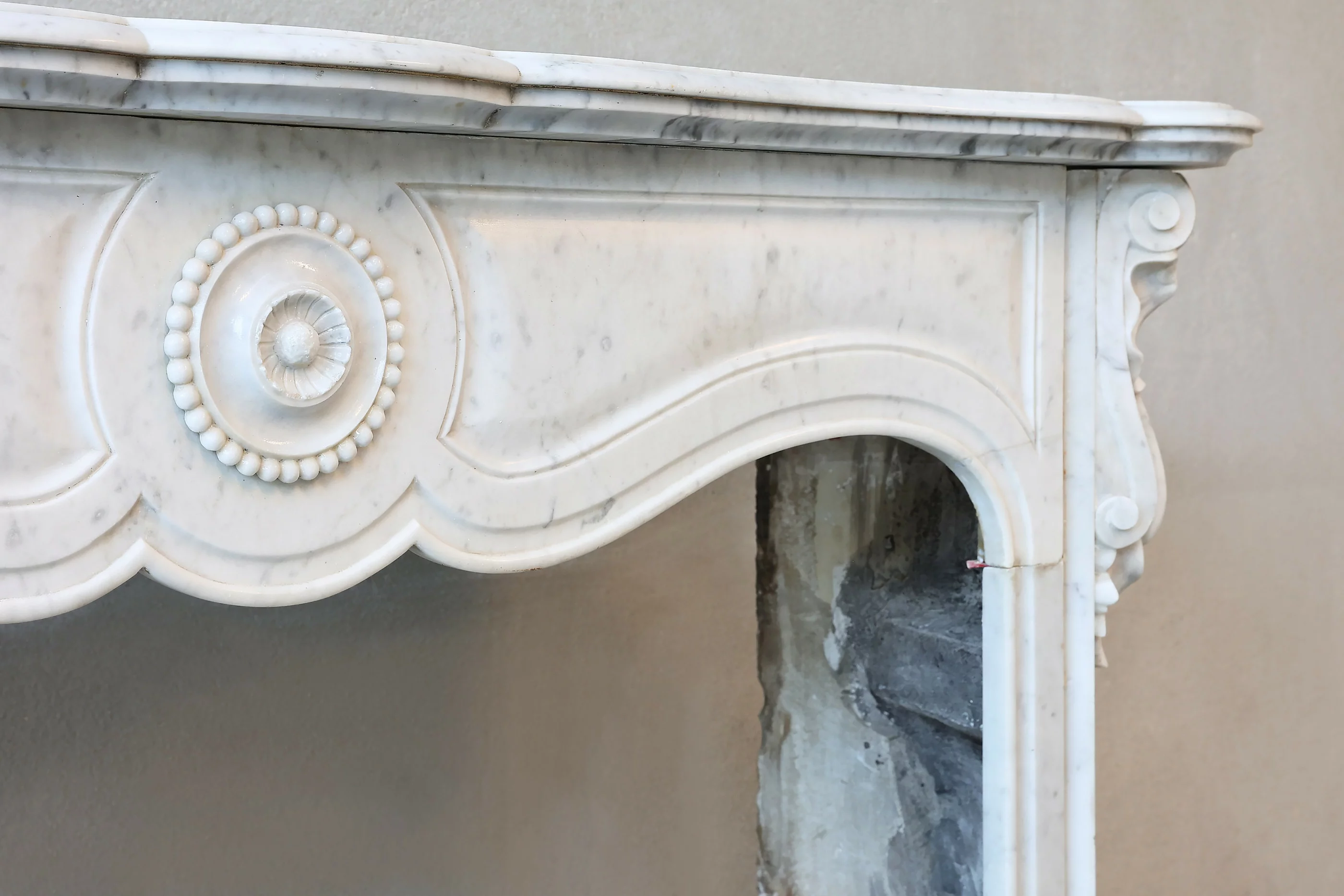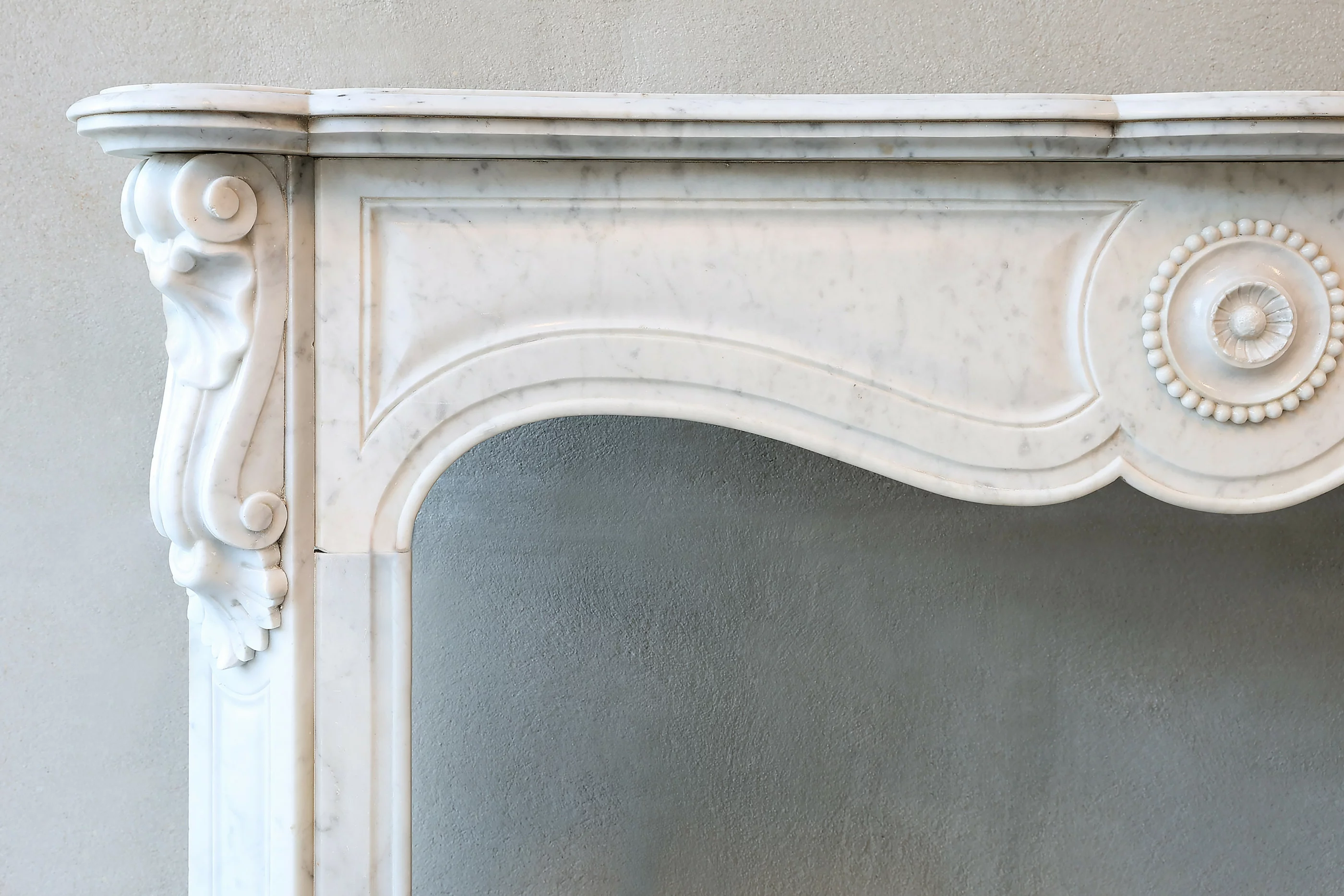 Mooie vriendelijke antieke schouw van Carrara marmer uit de 19e eeuw. Deze schouw is in stijl van Pompadour en heeft mooie ornamenten in het frontgedeelte en op de benen! Het formaat is compact en toepasbaar voor vele interieurs.