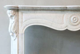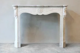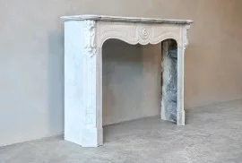 Mooie vriendelijke antieke schouw van Carrara marmer uit de 19e eeuw. Deze schouw is in stijl van Pompadour en heeft mooie ornamenten in het frontgedeelte en op de benen! Het formaat is compact en toepasbaar voor vele interieurs.