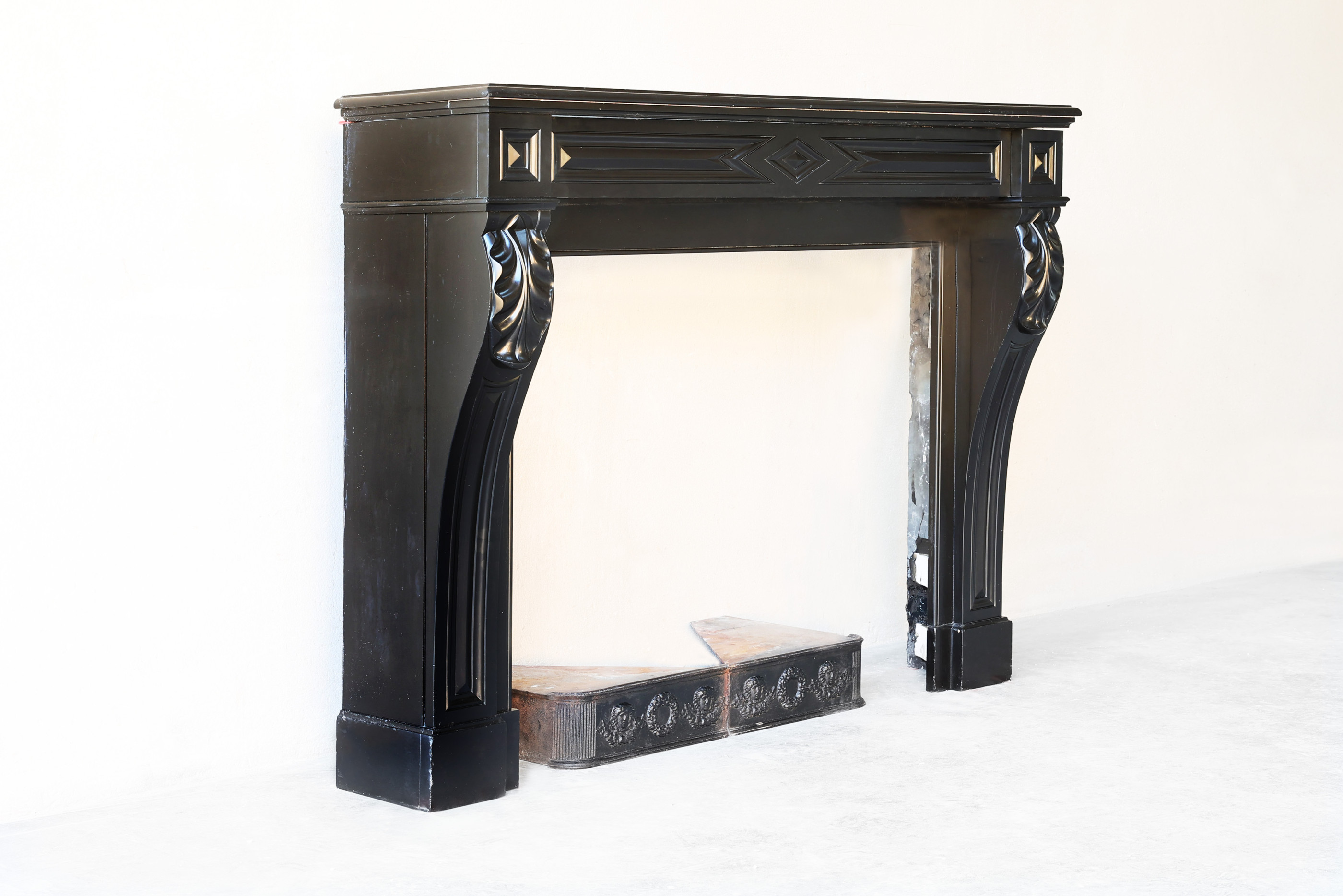 Mooie Noir de Mazy marmeren schouw uit de 19e eeuw in stijl van Louis XVI. Deze antieke schouw heeft een recht bovenstuk en licht gebogen benen. De schouw heeft mooie ornamenten en versieringen en past binnen vele interieurs.