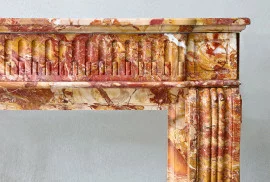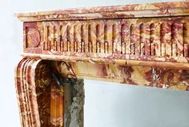 Prachtige kleurrijke antieke schouw van Breche de Saint Maxim marmer. Deze mantel stamt uit de 19e eeuw en heeft mooie handgekapte bewerkingen in het frontgedeelte van de schouw en op de benen! Een schouw met allure en uitstraling en door de maatvoering toepasbaar in vele interieurs.