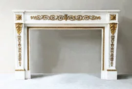 Zeer chique antieke schouw van Carrara marmer met verguld goud. Een elegante schouw met prachtige ornamenten en decoraties in verguld goud in het frontgedeelte en doorlopend op de benen. Deze schouw uit de 19e eeuw is in stijl van Louis XVI en hebben wij gehaald uit een appartement in Parijs en is een aanwinst binnen onze collectie antieke schouwen.