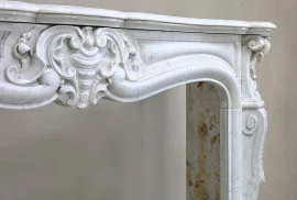 Zeer mooie schouw van wit Carrara marmer uit de 19e eeuw. Carrara marmer komt oorspronkelijk uit Italië, uit het plaatsje Carrara. Deze stad wordt ook wel de stad van het marmer genoemd omdat rondom Carrara heel wat marmergroeven liggen waar al eeuwenlang marmer gewonnen wordt. Deze open haard is in stijl van Louis XV en heeft prachtige ornamenten in het frontgedeelte en op de benen. Een elegante mantel met rechte benen met een chique uitstraling.
