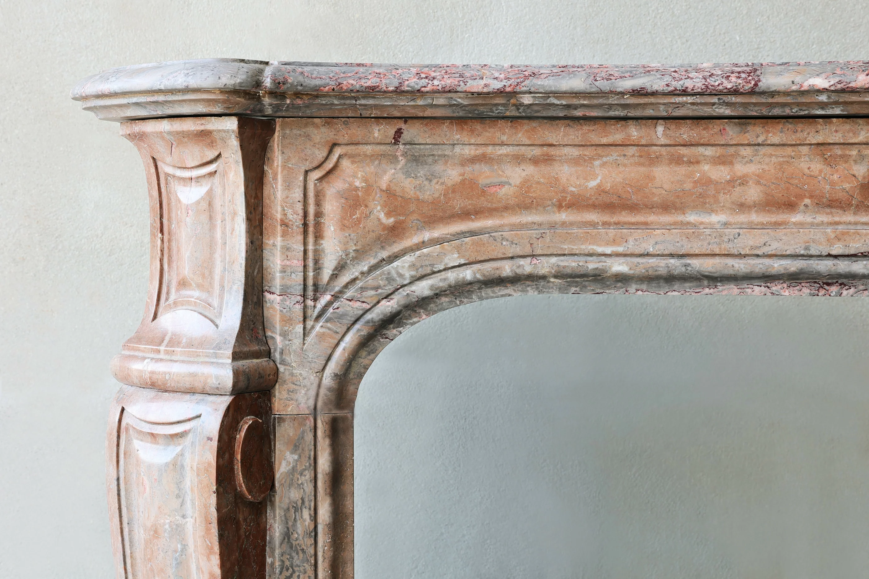 Zeer mooie antieke schouw van de warme marmersoort Sarrancolin! Deze schouw is in stijl van Pompadour en stamt uit de 19e eeuw. Deze marmersoort heeft een unieke en elegante uitstraling en is een meerwaarde voor elk interieur.