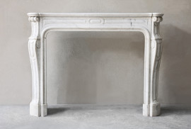 Mooie elegante schouw van witte Carrara marmer uit de 19e eeuw in stijl van Louis XV. Deze schouw heeft een ornament in het midden van het frontgedeelte en mooie belijningen op de benen. De originele roosters zitten nog op de zijkanten van de open haard.