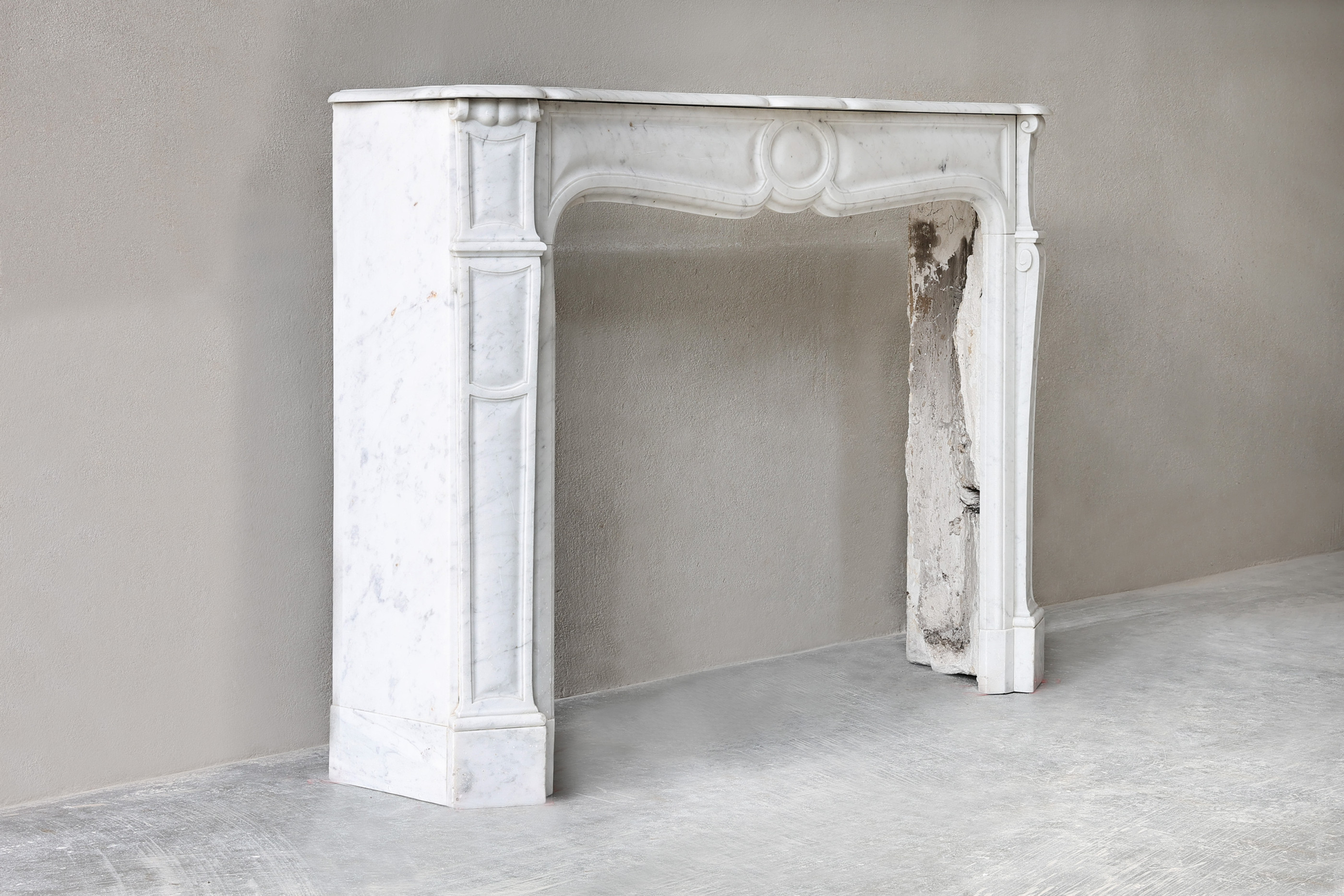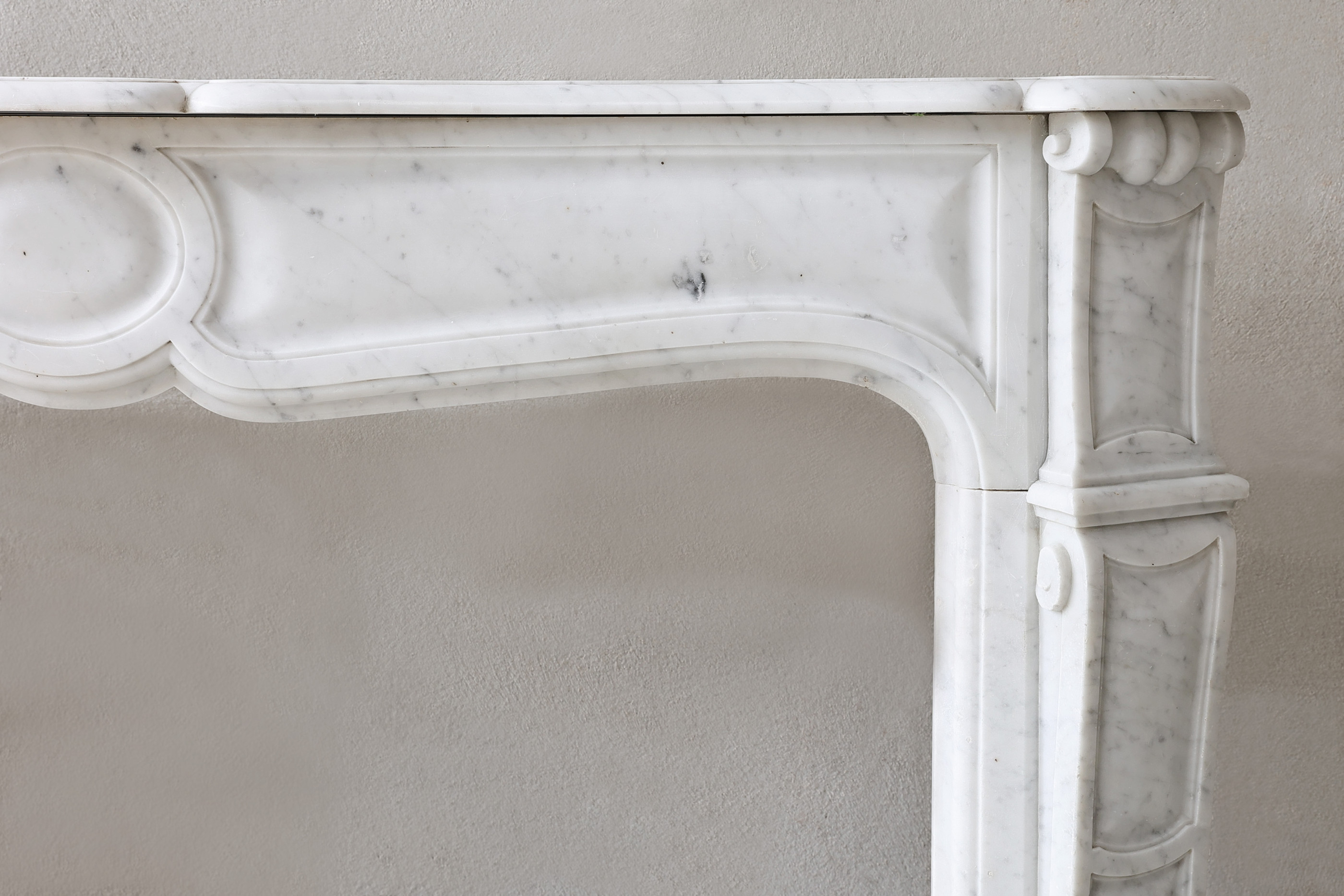 Prachtige antieke marmeren schouw Twee identieke schouwen van Carrara marmer! Deze twee schouwen zijn in stijl van Pompadour, kenmerkend door het ronde ornament in het midden van het frontgedeelte. Een zeer zeldzame combinatie uit de 19e eeuw die perfect zouden passen binnen uw interieur!