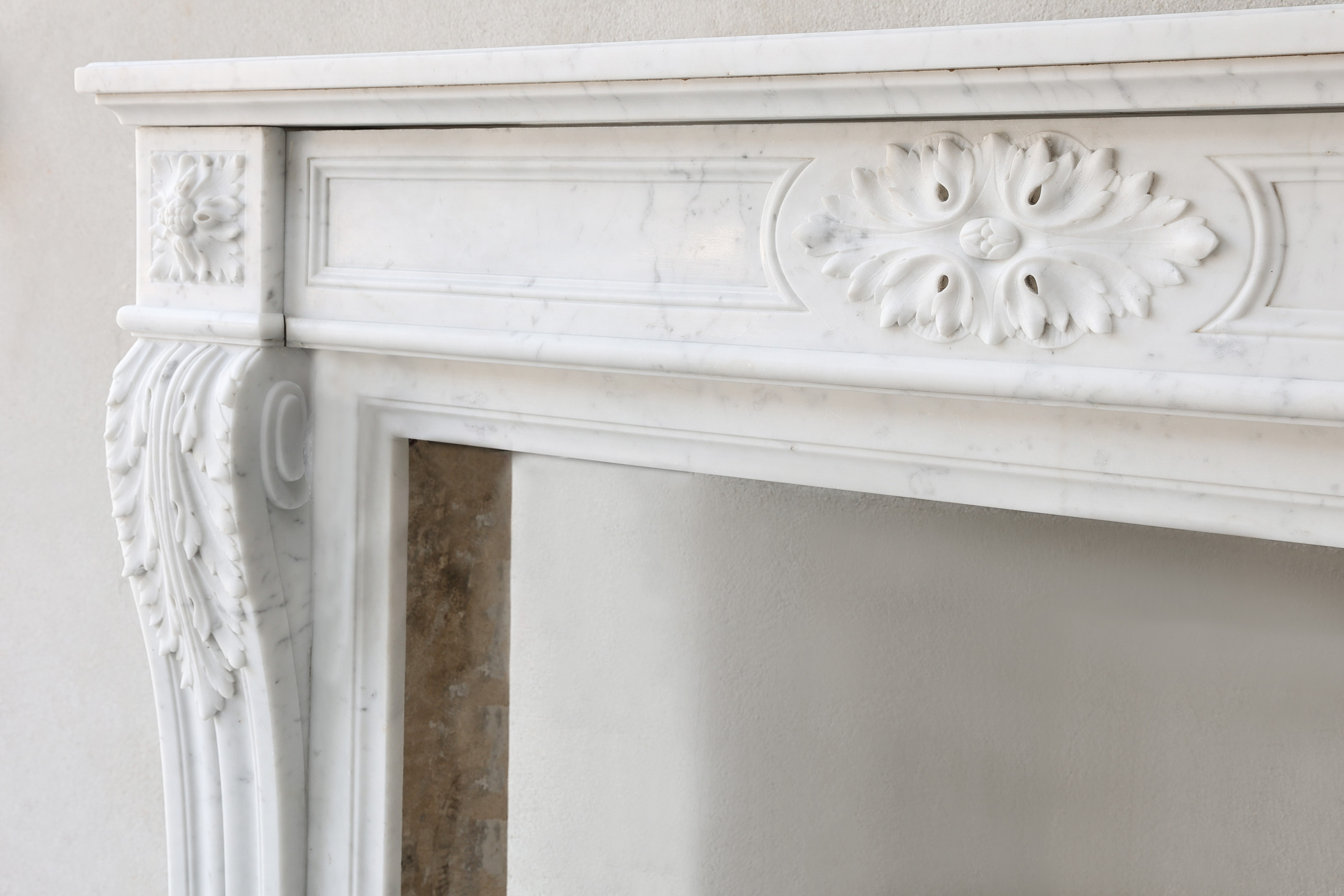 Prachtige antieke marmeren schouw van witte Carara marmer uit Italië. Deze schouw uit de 19e eeuw is in stijl van Louis XVI. De consolen zijn voorzien van cannelures, acanthus bladeren en rozettes in de hoeken. Een hele sierlijke en elegante open haard die ook rust uitstraalt door de rustieke kleur wit.