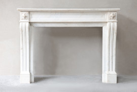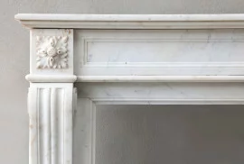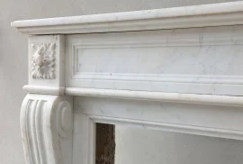 Deze antieke Carrara marmeren schouw in Louis XVI-stijl is een elegant voorbeeld van klassieke schoonheid. Het witte marmer heeft subtiele aderen en een verfijnde afwerking. De schouw uit de 19e eeuw heeft strakke lijnen met mooie versieringen, zoals gedetailleerde pilasters en elegate ornamenten. Een zeer waardevol meubelstuk voor elk interieur.