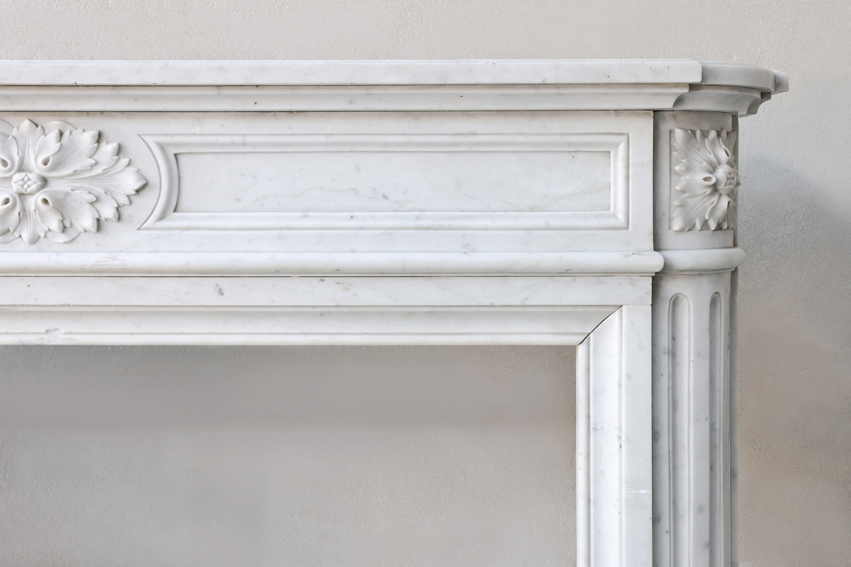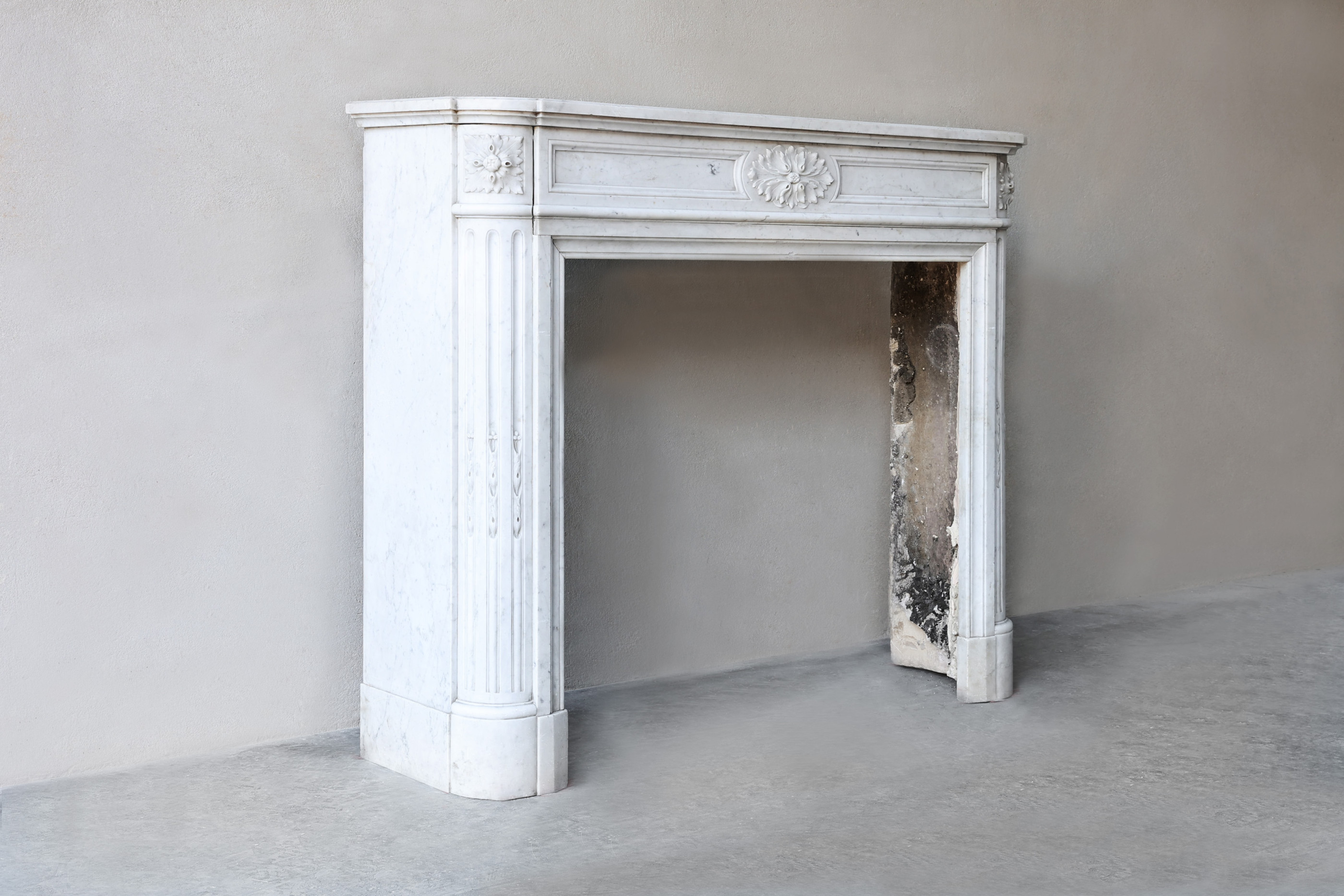 Mooie compacte schouw van Carrara marmer uit Italië. Een sierlijke antieke open haard met ornamenten in het midden op de benen en ronde vormen! Deze authentieke mantel is in stijl van Louis XVI en ademt historie en warmte uit. Het formaat maakt dat deze schouw voor vele interieurs geschikt is.