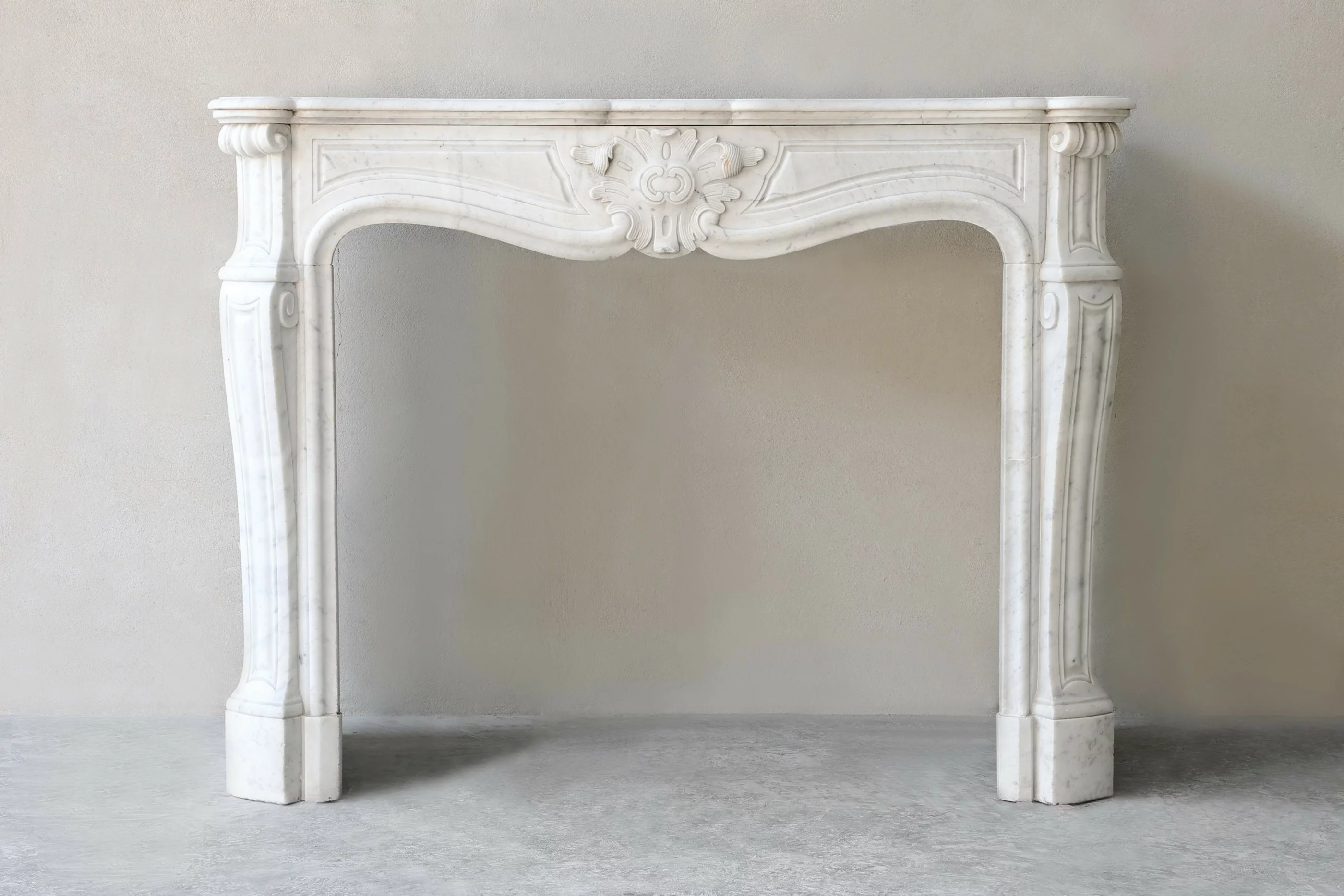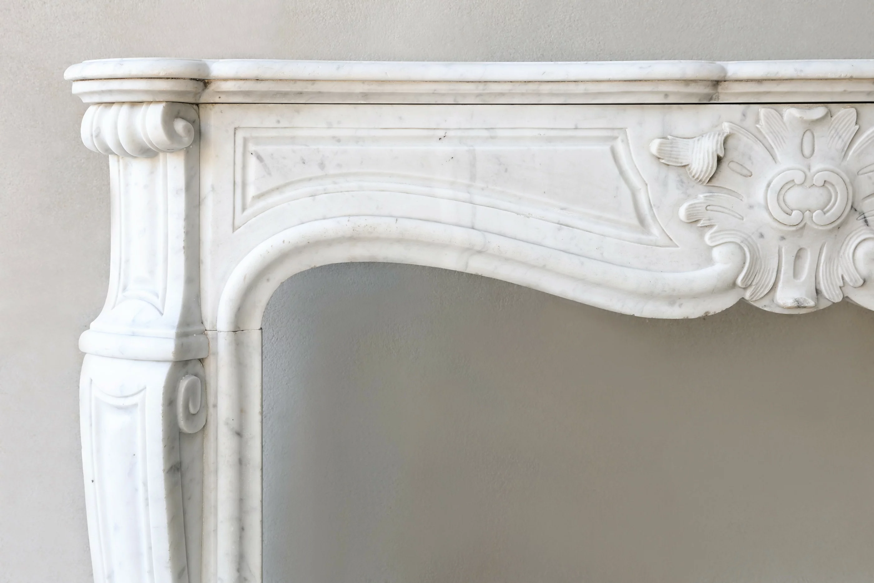 Mooie chique antieke schouw van Carrara marmer uit de 19e eeuw. Deze schouw is in stijl van Louis XV en heeft een prachtig ornament in het midden van het frontgedeelte. De mooie ronde belijningen op de benen zorgen voor een elegante en warme uitstraling. Een schouw met karakter en authenticiteit.