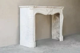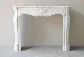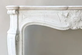Mooie chique antieke schouw van Carrara marmer uit de 19e eeuw. Deze schouw is in stijl van Louis XV en heeft een prachtig ornament in het midden van het frontgedeelte. De mooie ronde belijningen op de benen zorgen voor een elegante en warme uitstraling. Een schouw met karakter en authenticiteit.