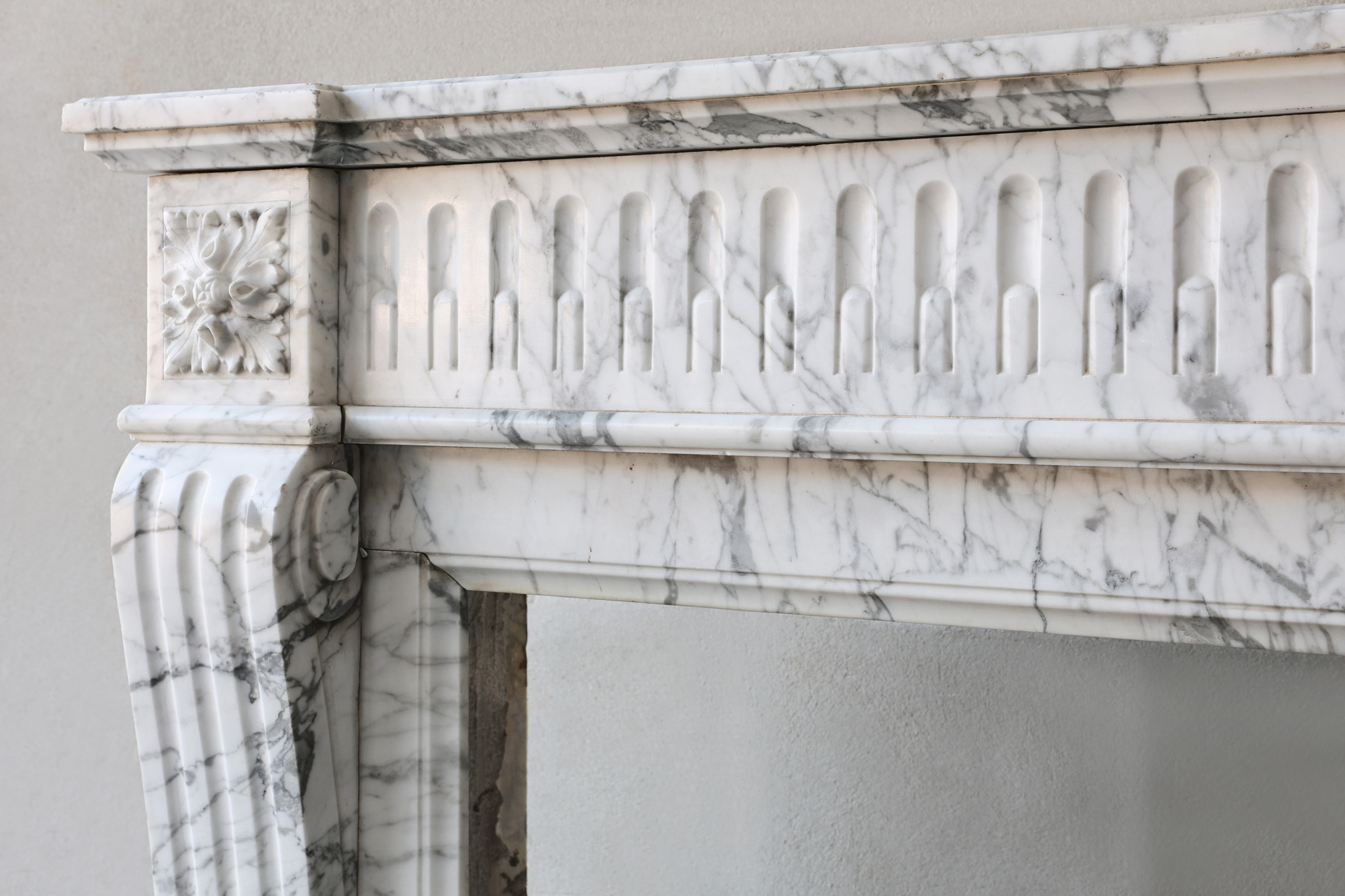 Elegante antieke schouw van Arabescato marmer uit de 19e eeuw. Deze mantel in stijl van Louis XVI heeft veel cannelures in het frontgedeelte en op de benen! Ook de ornamenten maken de open haard sierlijk. Arabescato marmer komt uit de groeven van de Apennijnen, een gebergte in Italië.