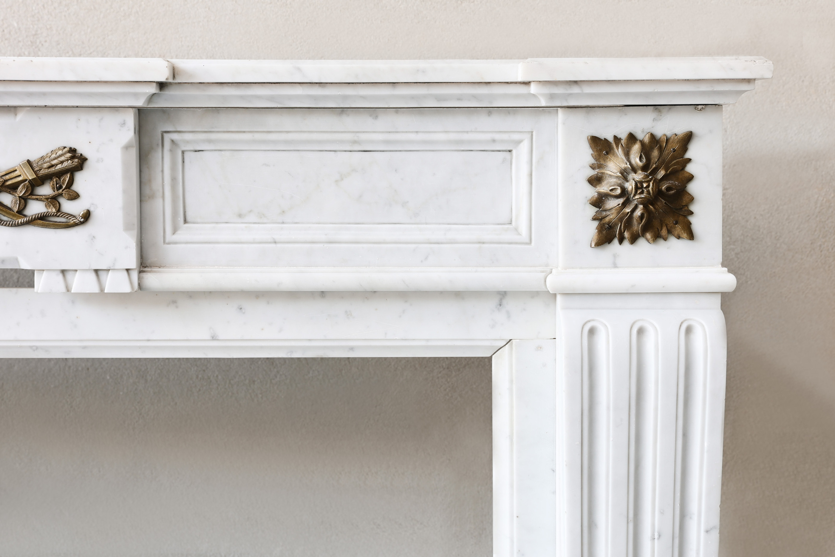 Zeer mooie sierlijke antieke schouw van carrara marmer met verguld goud uit de 19e eeuw. Een echte eye-catcher binnen uw interieur. Deze schouw in stijl van Louis XVI is voorzien van vergulde gouden ornamenten in het frontgedeelte, mooie belijningen en cannelures op de benen.