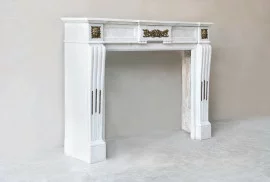 Zeer mooie sierlijke antieke schouw van carrara marmer met verguld goud uit de 19e eeuw. Een echte eye-catcher binnen uw interieur. Deze schouw in stijl van Louis XVI is voorzien van vergulde gouden ornamenten in het frontgedeelte, mooie belijningen en cannelures op de benen.
