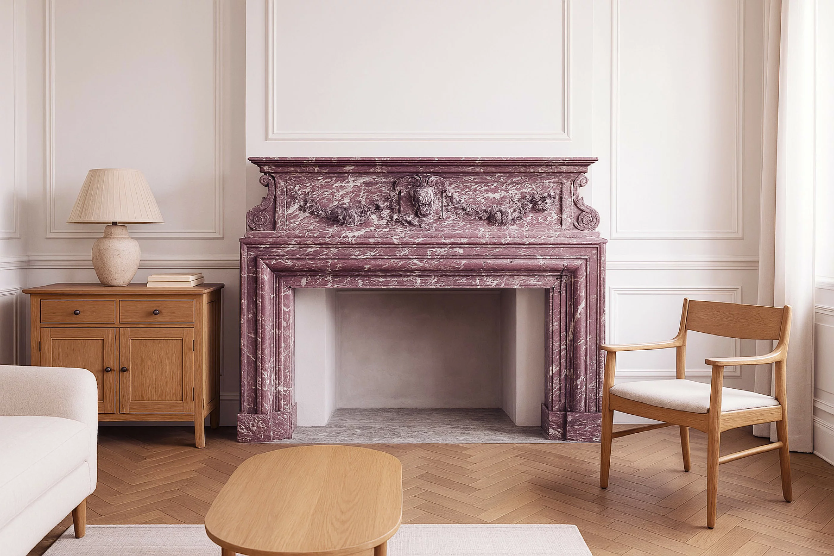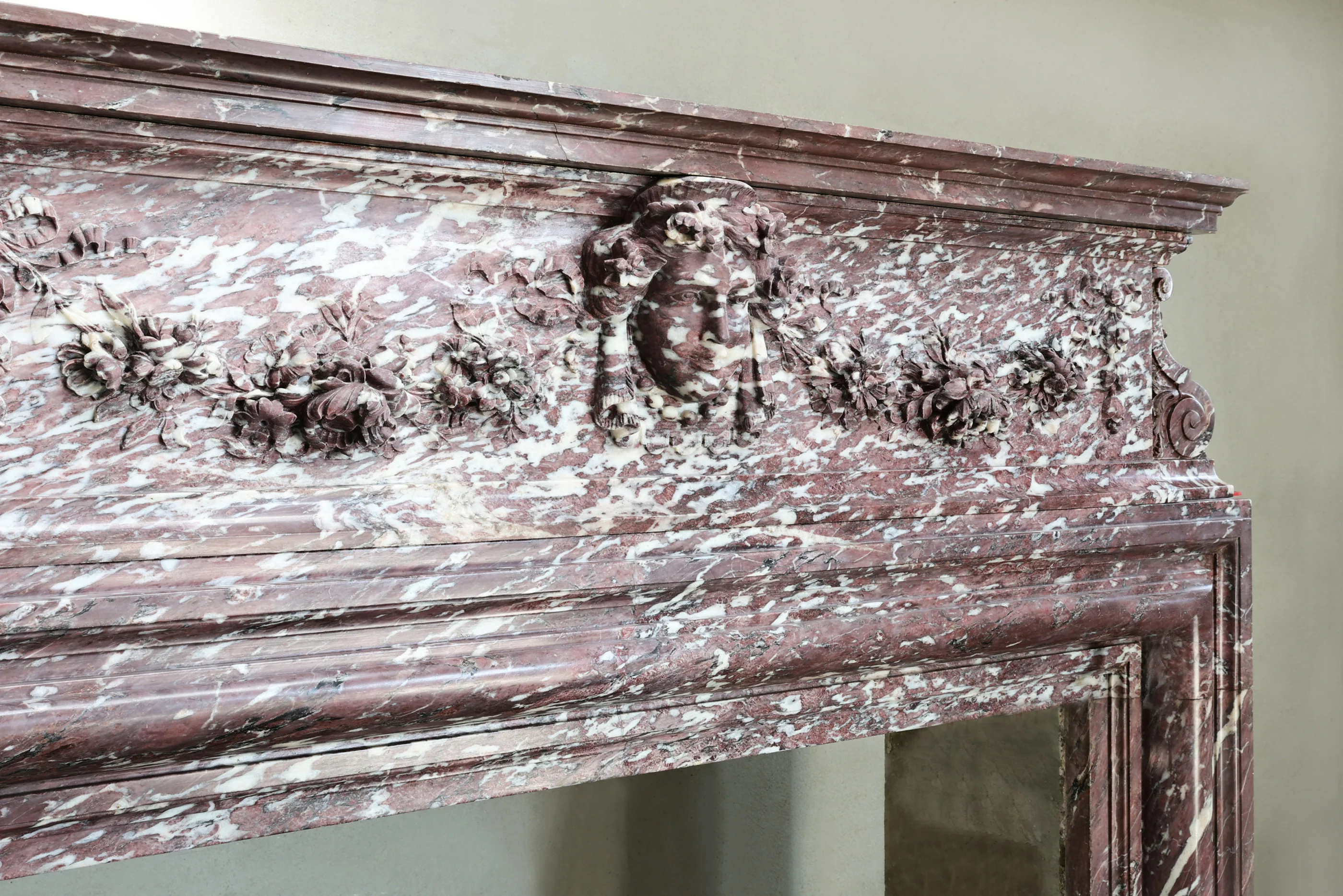 Prachtige, authentieke schouw in Louis XIII-stijl, vervaardigd uit het zeldzame Fleur de Pêche marmer. Deze elegante haardomlijsting dateert uit het begin van de 19e eeuw en is met zorg bewaard gebleven. Een stijlvol en tijdloos stuk, perfect om karakter en klasse toe te voegen aan elk interieur. Soortgelijke schouwen zijn te vinden in Grand Escalier Opera Garnier en in het Louvre.