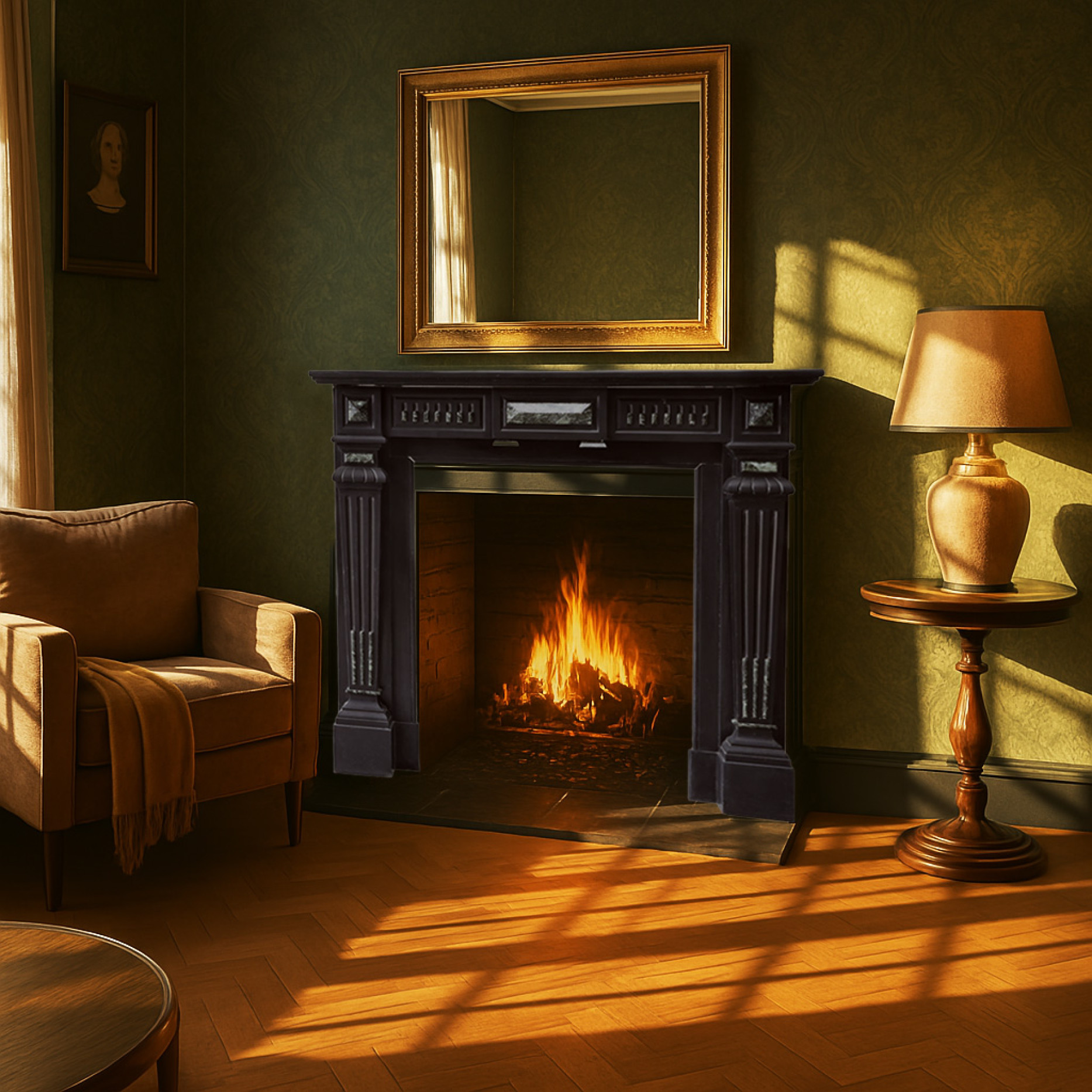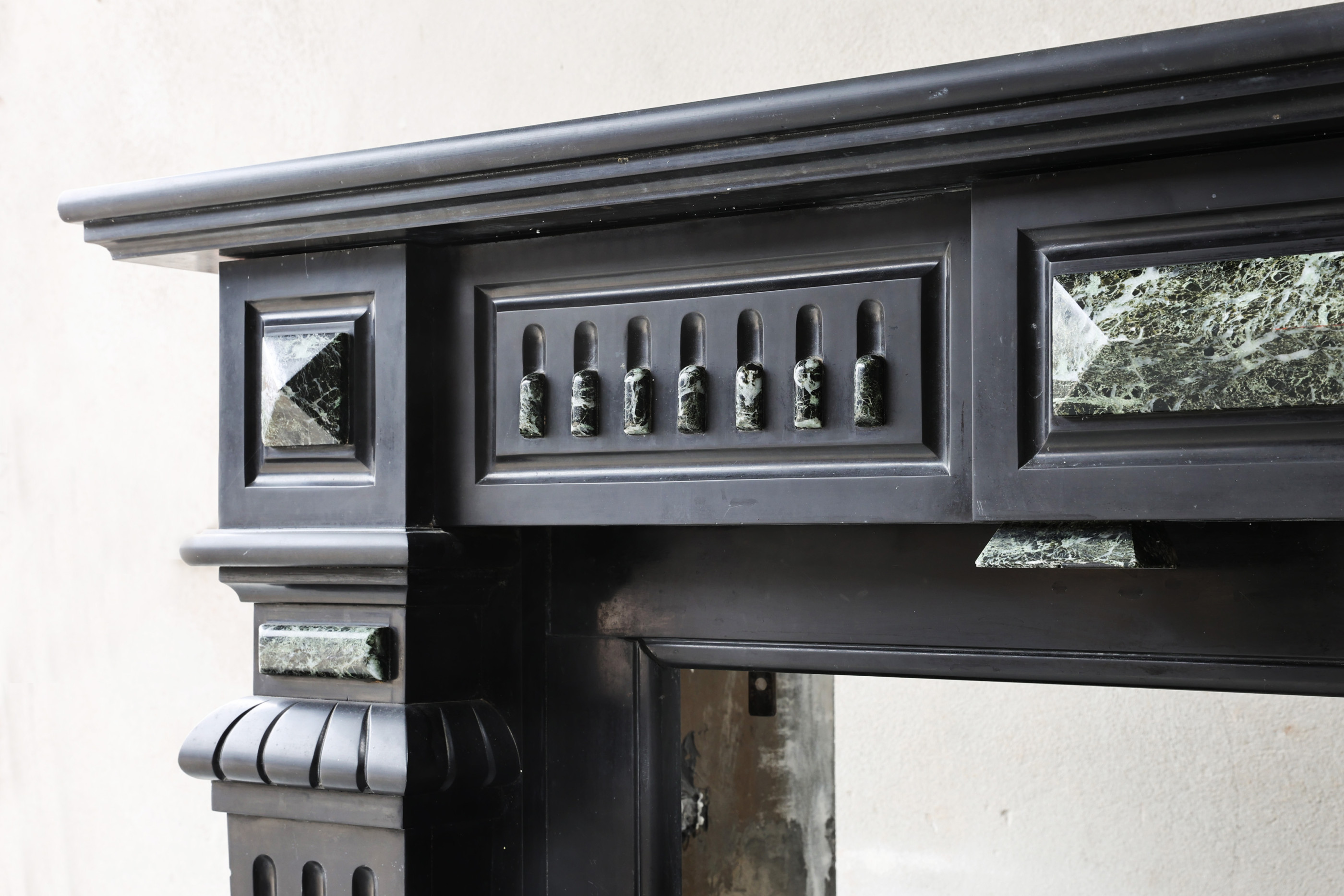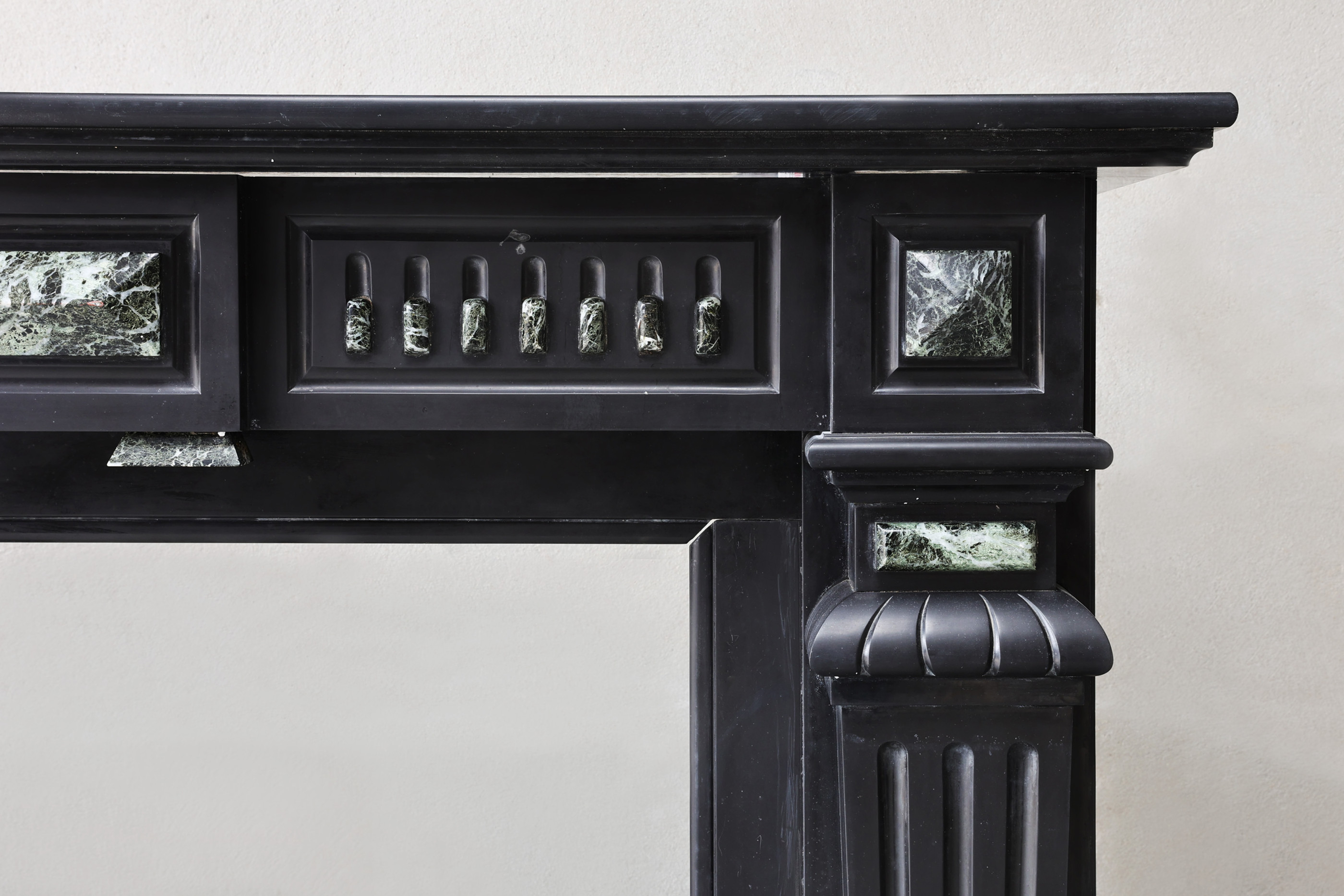 Deze elegante schouw uit de 19e eeuw is gemaakt van Noir de Mazy-marmer, een zeldzame zwarte steensoort uit België, met een klein stukje groene Vert de Mer marmer erin verwerkt. De diepe kleur en fijne details geven deze open haard een klassieke en stijlvolle uitstraling. Met zijn strakke lijnen en subtiele versieringen past deze schouw perfect in zowel een klassiek als modern interieur. Het is een unieke en tijdloze schouw die sfeer en karakter toevoegt aan elke ruimte. Een bijzonder stukje geschiedenis voor wie op zoek is naar iets echt bijzonders.