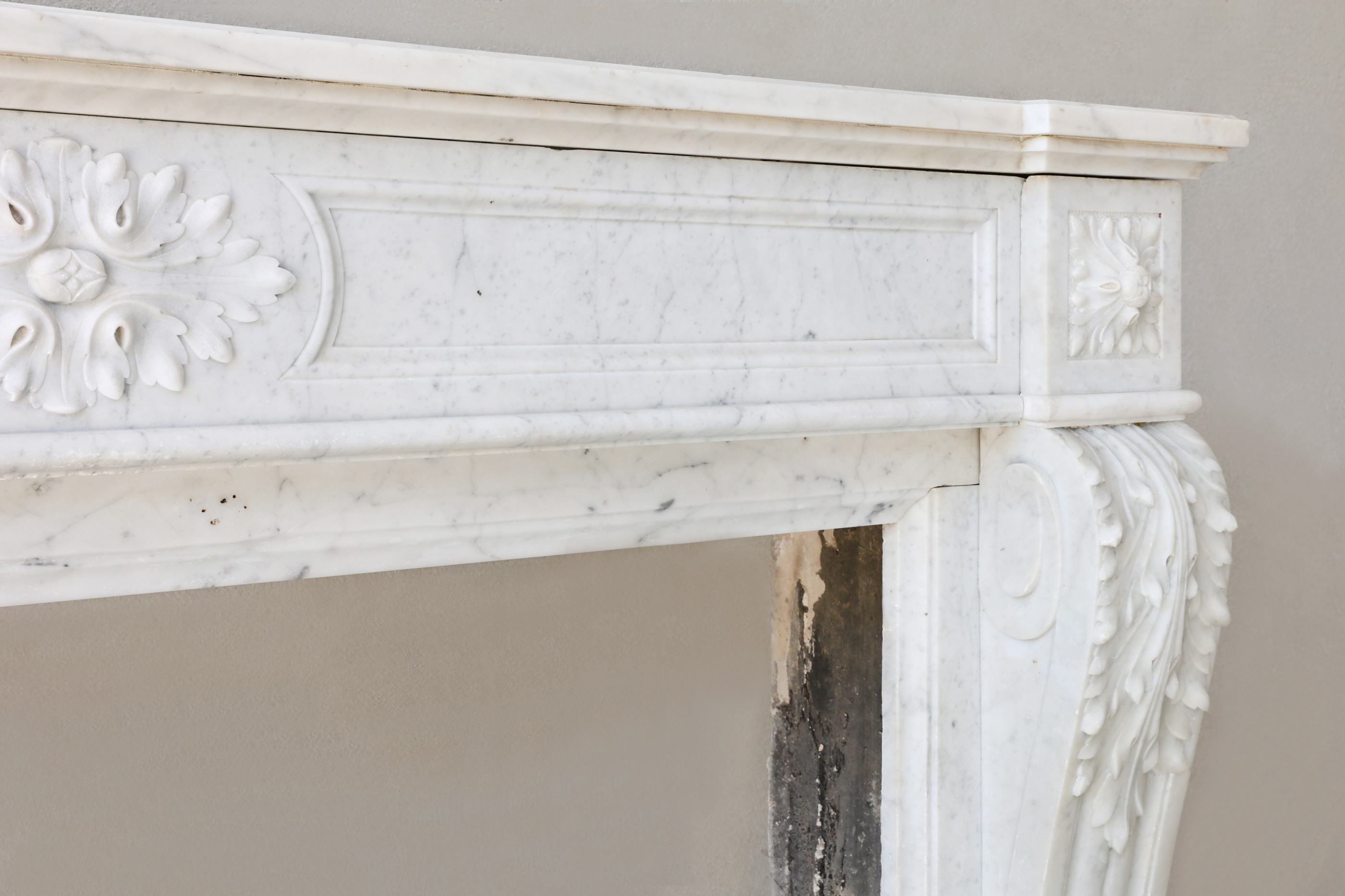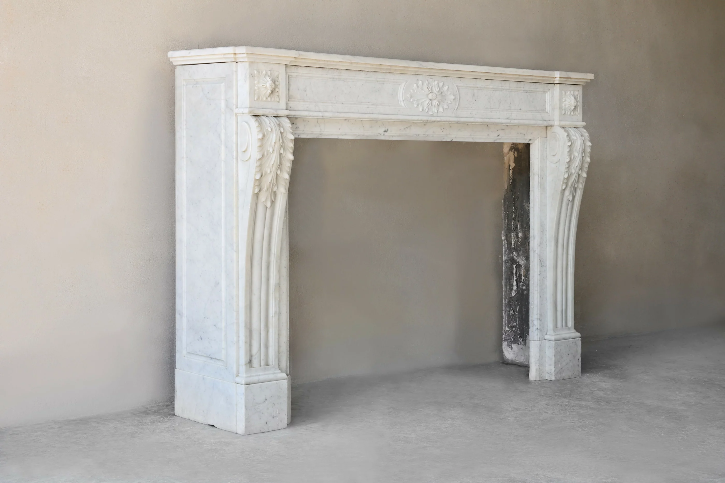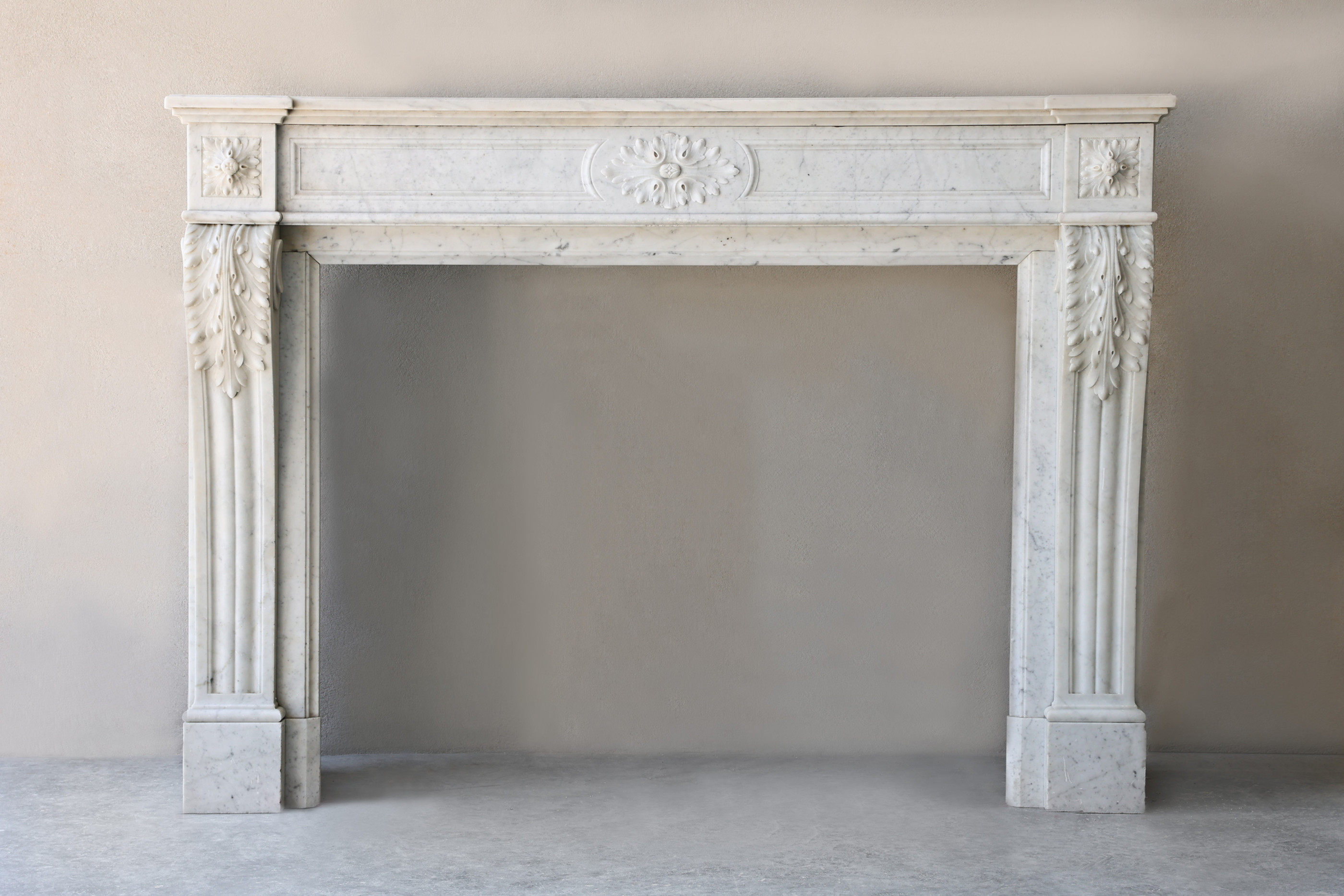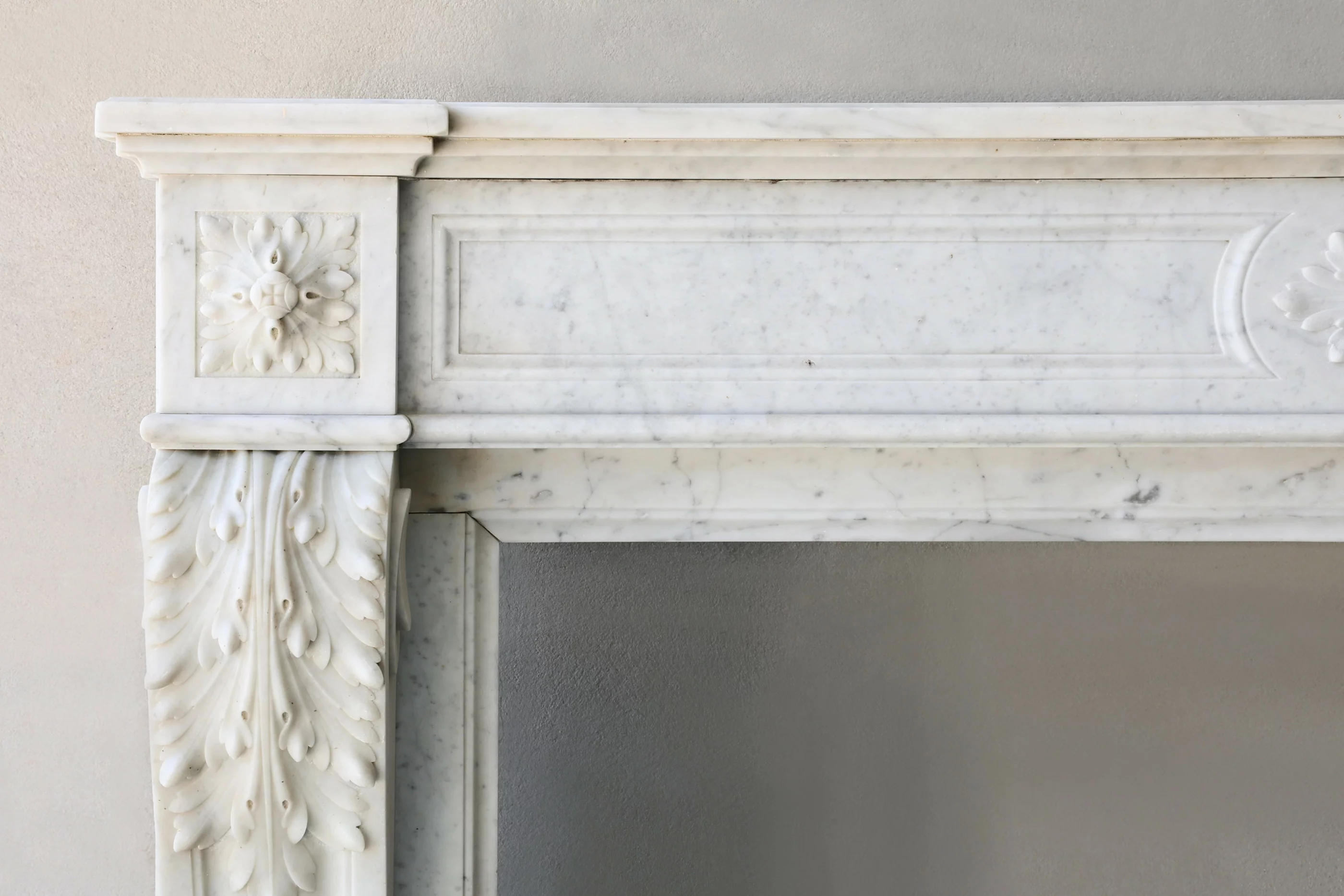 De schouw is vervaardigd uit verfijnd Carrara marmer, gewaardeerd om zijn homogeniteit en tijdloze uitstraling. Het front wordt gedragen door gefluteerde stijlen met bladkapitelen; het fries toont een centraal bloemmedaillon – kenmerkend voor de Louis XVI-stijl.
