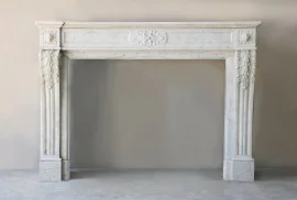 De schouw is vervaardigd uit verfijnd Carrara marmer, gewaardeerd om zijn homogeniteit en tijdloze uitstraling. Het front wordt gedragen door gefluteerde stijlen met bladkapitelen; het fries toont een centraal bloemmedaillon – kenmerkend voor de Louis XVI-stijl.
