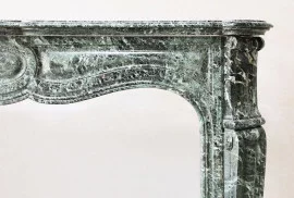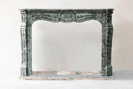 Ontdek deze zeldzame antieke marmeren schouw uit de 19e eeuw, vervaardigd uit exclusief Vert de Mer marmer in elegante Pompadour stijl. Met sierlijke lijnen en klassiek vakmanschap is dit een verfijnd pronkstuk voor elk interieur.  Ideaal voor liefhebbers van Franse antiek, klassieke schouwen en exclusief marmerwerk.