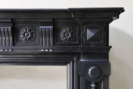 De combinatie van strak lijnenspel en rijke ornamentiek maakt de schouw geschikt voor zowel moderne als klassieke interieurs.