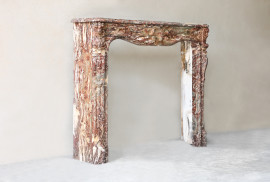 Deze authentieke antieke marmeren schouw is vervaardigd uit het zeldzame Rouge Royal marmer – een rijke roodbruine steen met delicate aderen. Het ontwerp in **Louis XV-stijl** kenmerkt zich door sierlijke lijnen, verfijnde sorgue-achtige vormen en harmonieuze proporties.