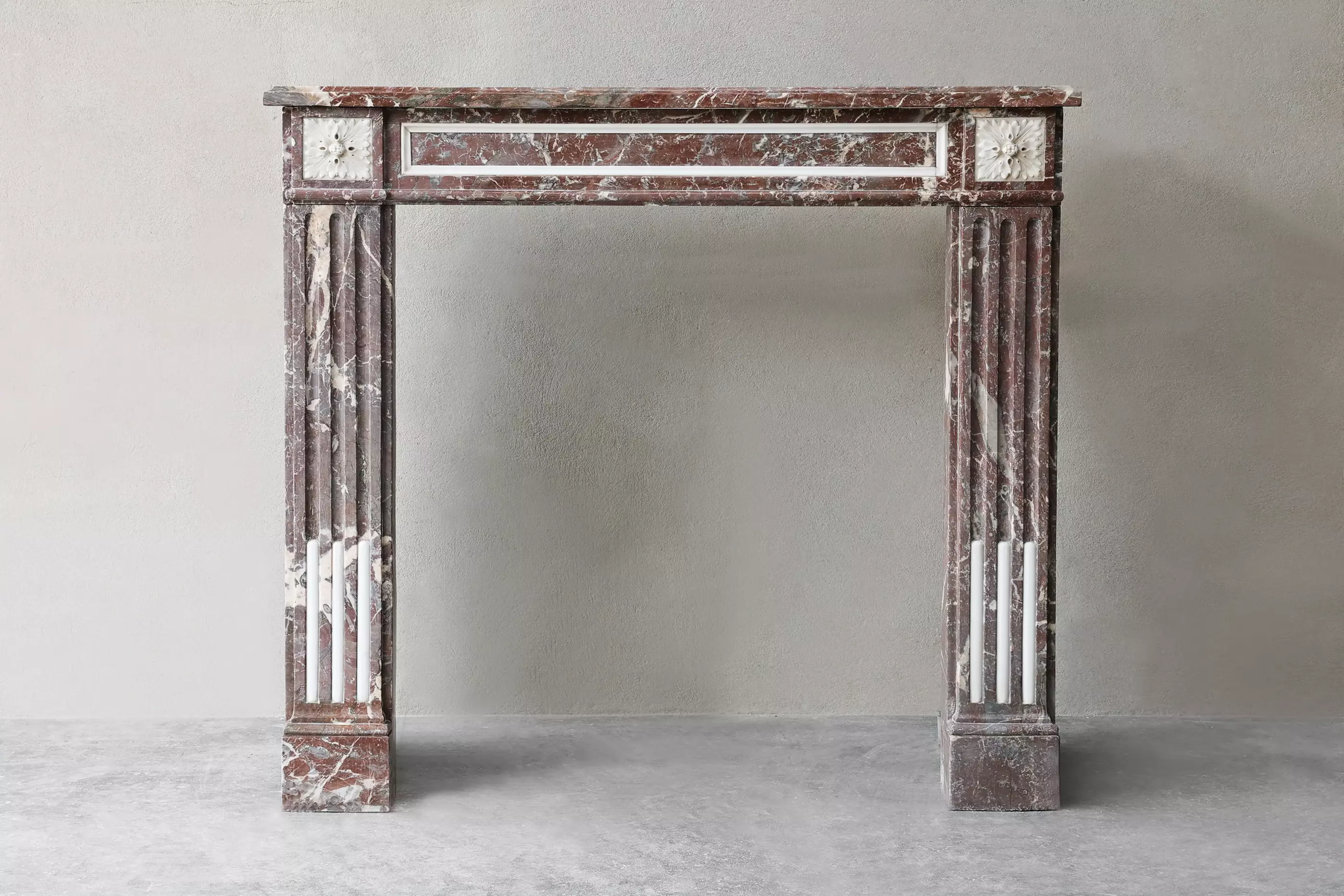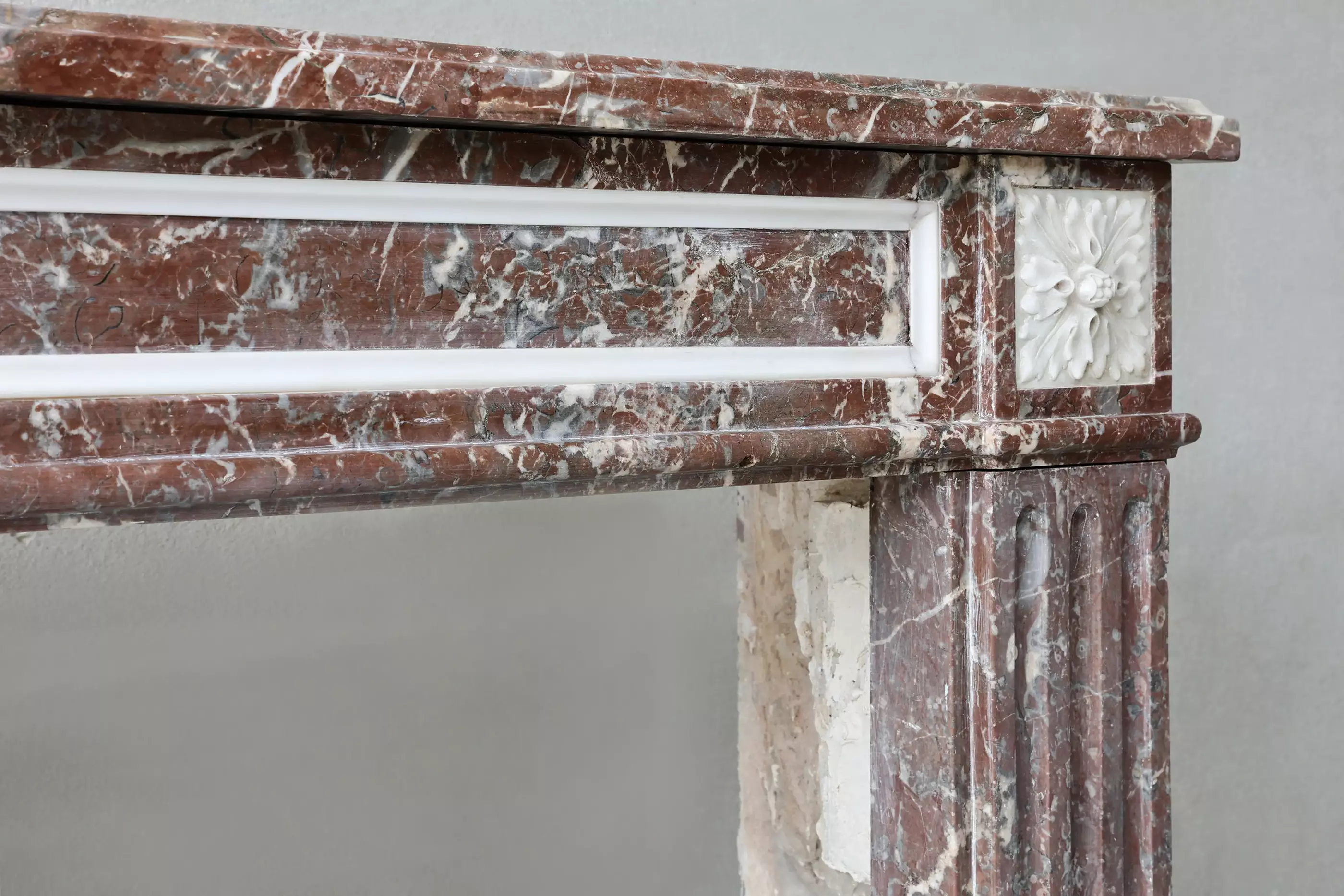 19e-eeuwse Rouge Royal – een uitzonderlijke antieke schouw in dieprood Belgisch marmer met witte adering, uitgevoerd in Louis XVI-stijl. Dit exemplaar combineert strakke proporties met fijn gedetailleerde rozetten, cannelures en subtiele witmarmeren inleg.