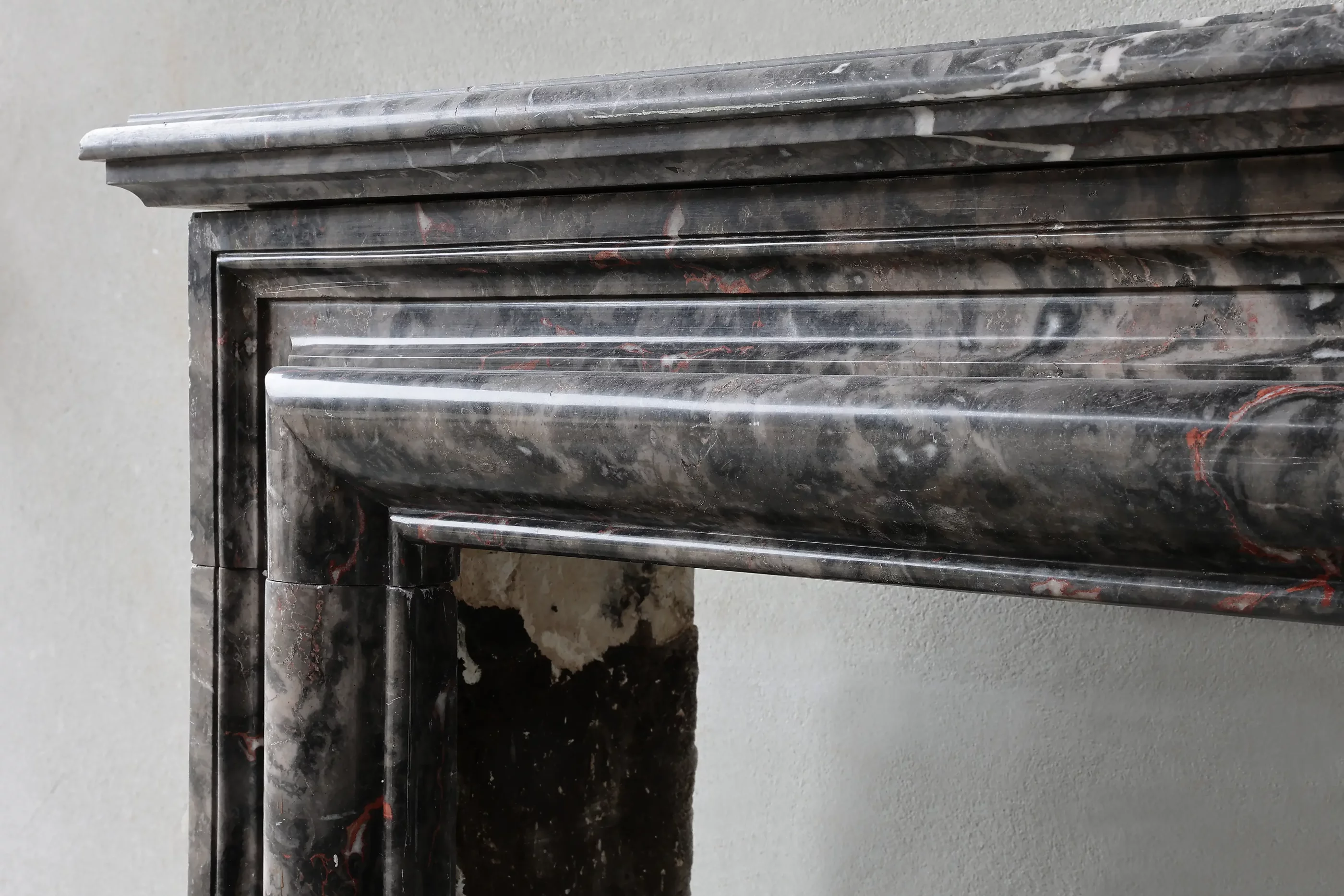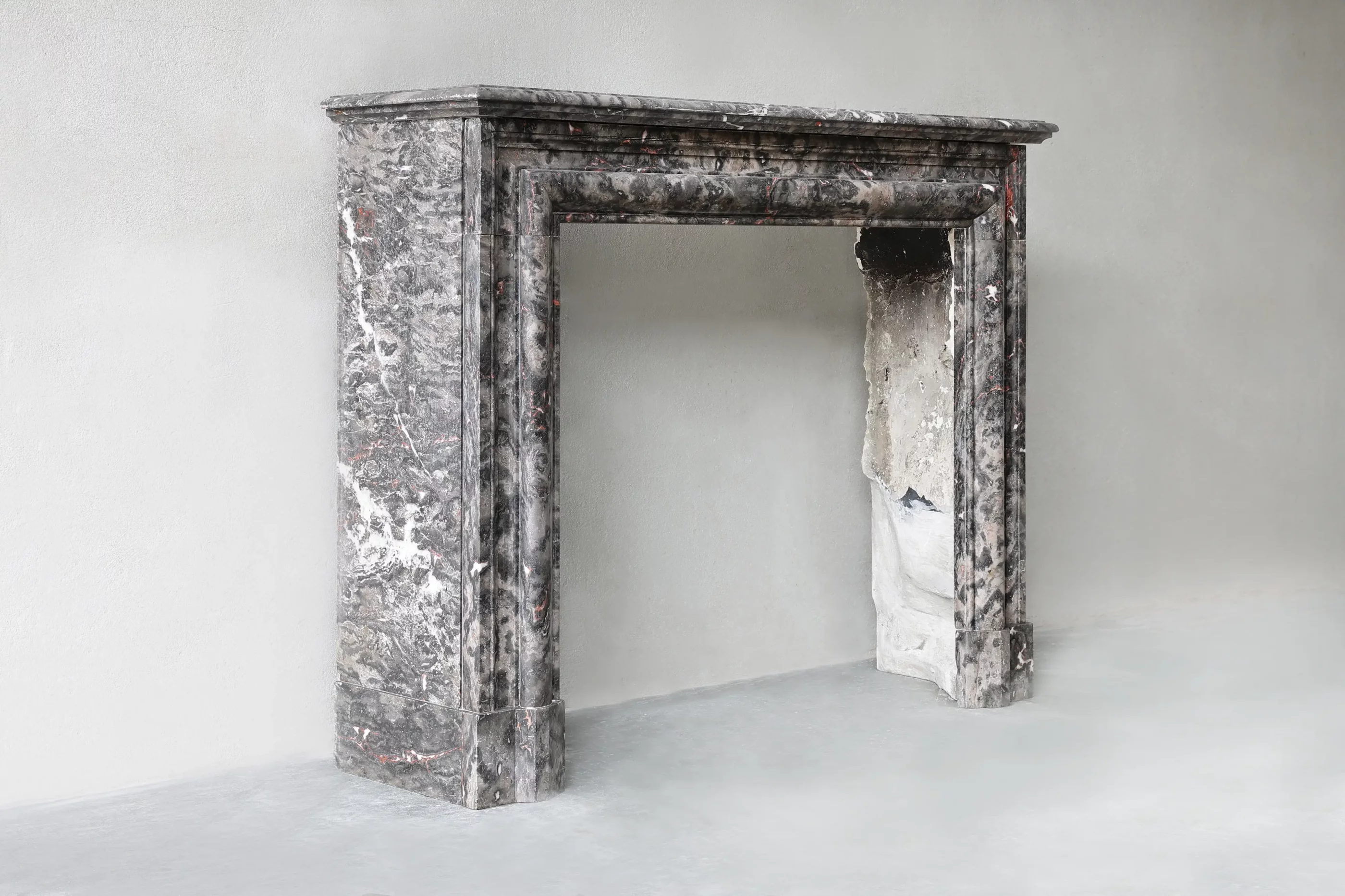Het grijze marmer en de sobere opbouw maken deze schouw geschikt voor interieurs waar een antiek element gewenst is zonder overdadige decoratie. Binnen de Lodewijk XIV-traditie ligt de nadruk op symmetrie en duidelijke profielen, waardoor de omkadering strak in het ontwerp kan worden ingepast.