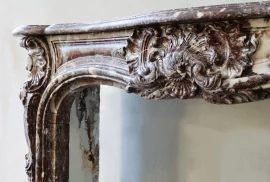 Deze antieke schouw is uitgevoerd in massief, natuurlijk geaderd marmer met een rood- en crèmekleurige tekening. De schouw bestaat uit een geprofileerde bovenlijst, een gebogen binnenopening en rijk gesneden stijlen. Het geheel is volledig uit marmer gehouwen en bedoeld als blijvend architectonisch element in een interieur- of restauratieproject.