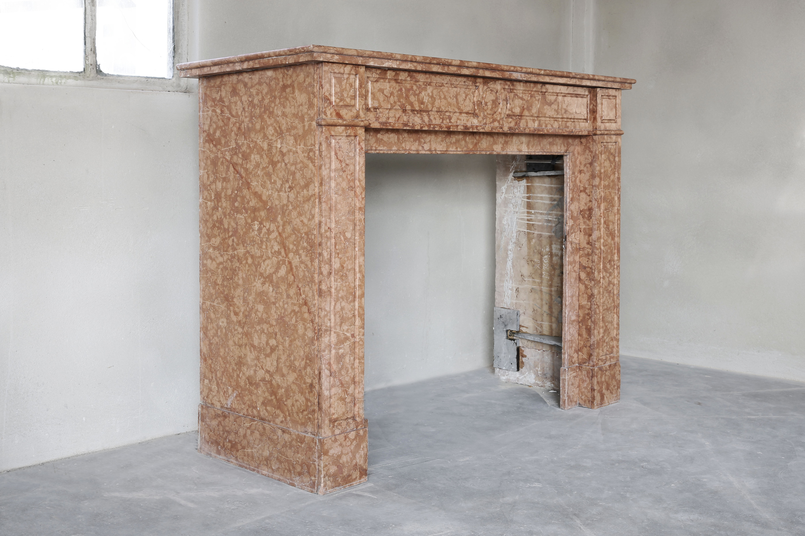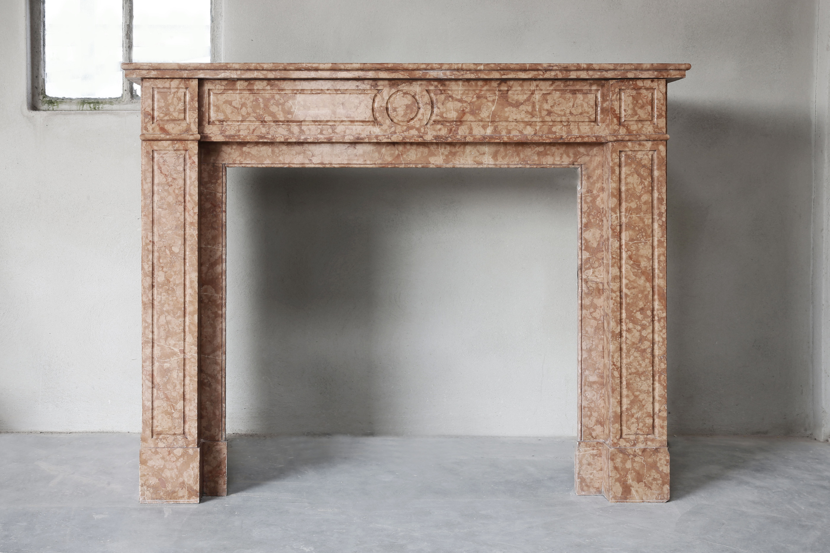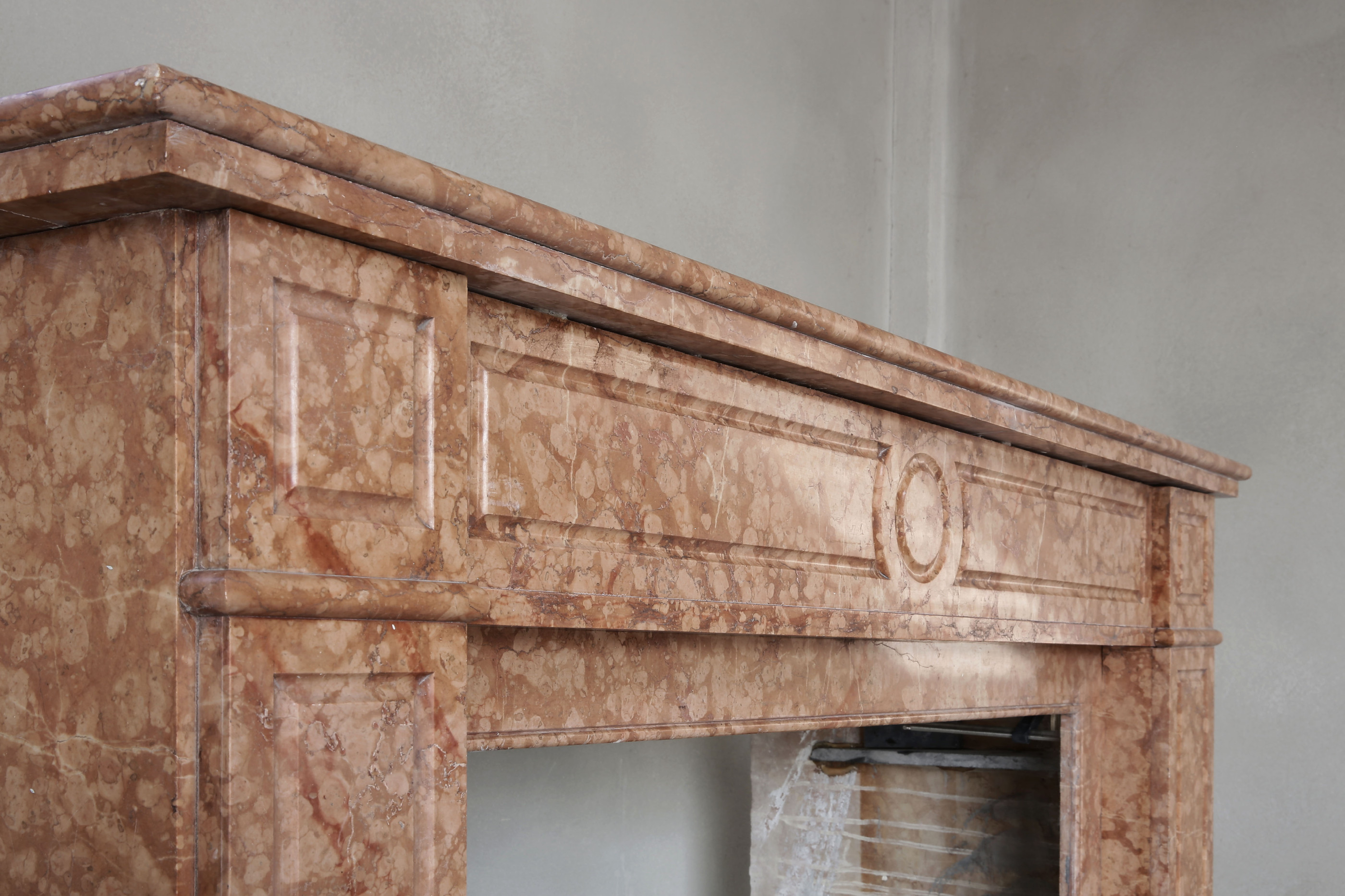 Mooie warme antieke marmeren schouw van de marmersoort Rouge de Verrona. Deze marmersoort komt uit Italië en heeft een oranje/bruine kleurstelling. De schouw stamt uit de 19e eeuw en uit de tijd van Louis XVI. De antieke schouw heeft mooie belijningen en is voorzien van een ornament in het midden van het frontgedeelte.