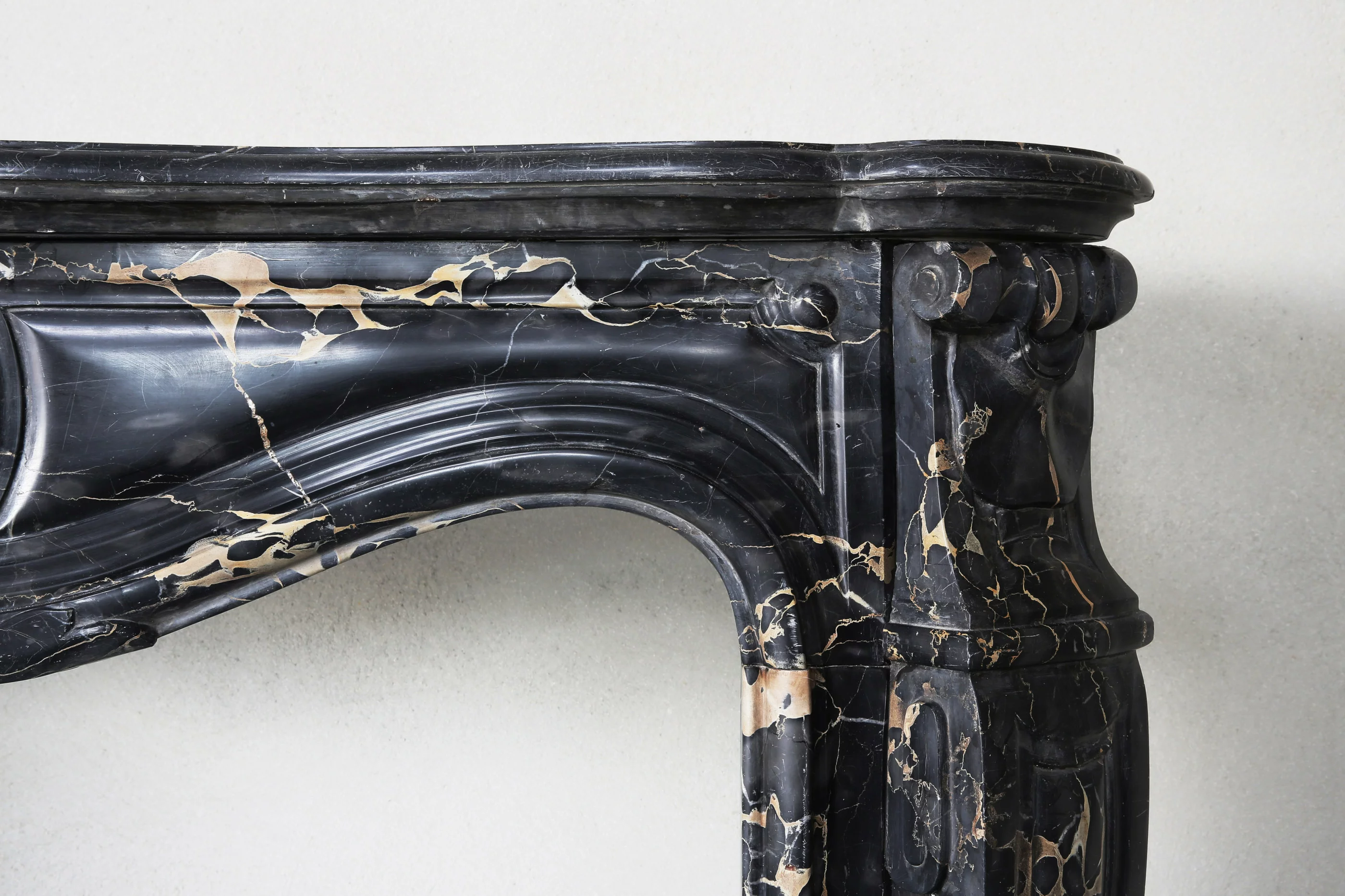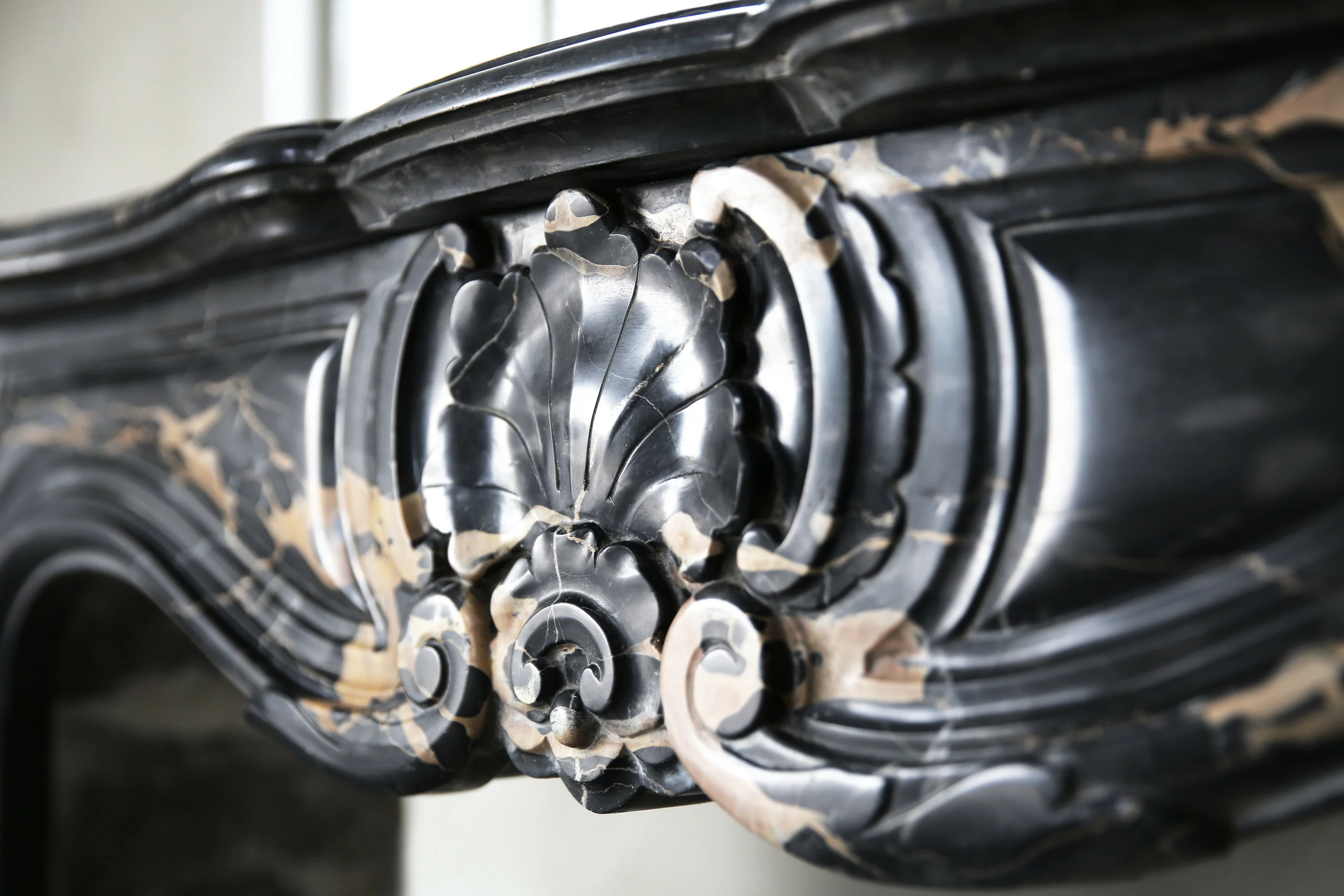 Een zeldzame antieke marmeren schouw van oude Portoro marmer uit Toscane. Portoro marmer is één van de meest elegante Italiaanse marmersoorten. De zwarte achtergrond met gouden aders zorgt voor luxe en exclusiviteit. De schouw is in stijl van Louis XV en stamt uit de 19e eeuw. Voorzien van een mooie coquille in het midden van het blad. Ook de benen zijn versierd met ornamenten. Een chique schouw met een warme uitstraling die perfect past in een modieuze, landelijke of klassieke woning!