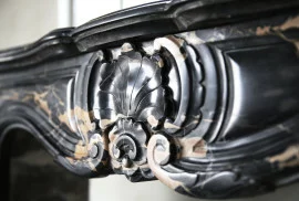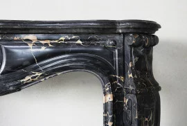 Een zeldzame antieke marmeren schouw van oude Portoro marmer uit Toscane. Portoro marmer is één van de meest elegante Italiaanse marmersoorten. De zwarte achtergrond met gouden aders zorgt voor luxe en exclusiviteit. De schouw is in stijl van Louis XV en stamt uit de 19e eeuw. Voorzien van een mooie coquille in het midden van het blad. Ook de benen zijn versierd met ornamenten. Een chique schouw met een warme uitstraling die perfect past in een modieuze, landelijke of klassieke woning!