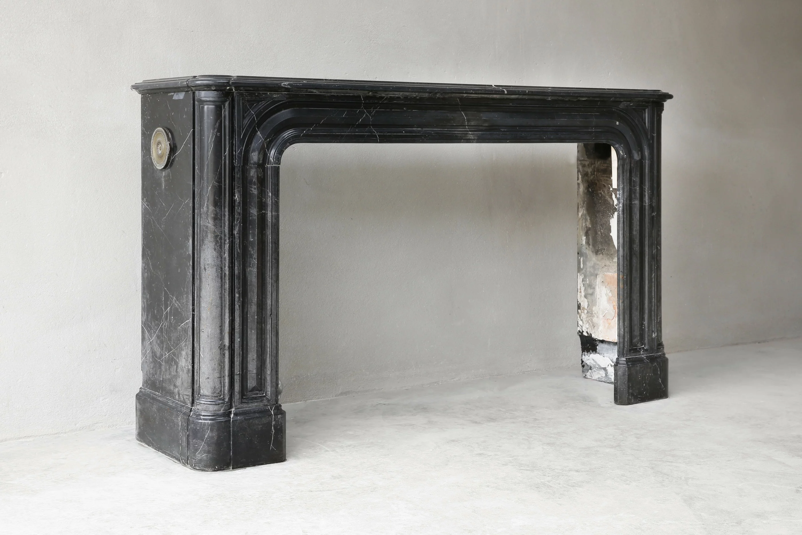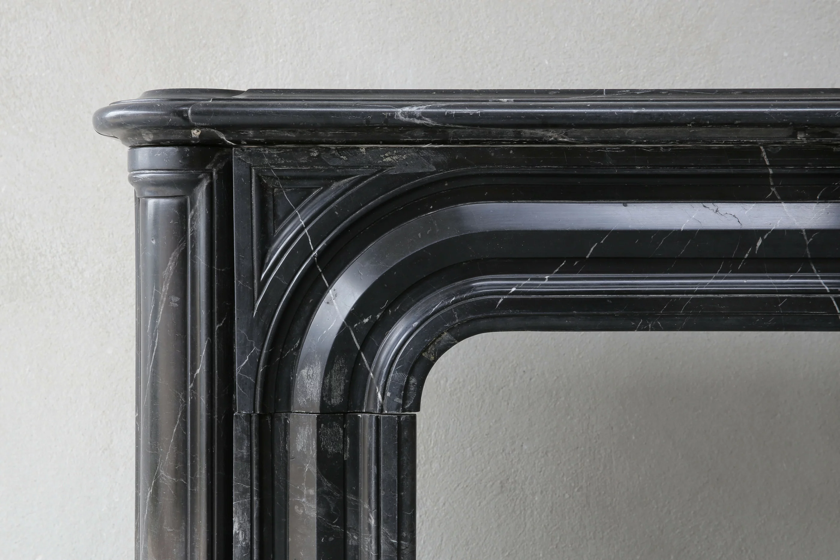Mooie antieke marmeren schouw van Nero Marquina marmer. Deze marmersoort komt uit het Noorden van Spanje. Bij deze marmersoort zie je witte aders, in tegenstelling tot Noir de Mazy marmer dat egaal zwart van kleur is. Deze schouw stamt uit de 19e eeuw en is in stijl van Louis XIV. Een mooi model door de eenvoud en ronde vormen. Echt een hele mooie marmersoort die chique is en past in zowel een klassieke als moderne woning.