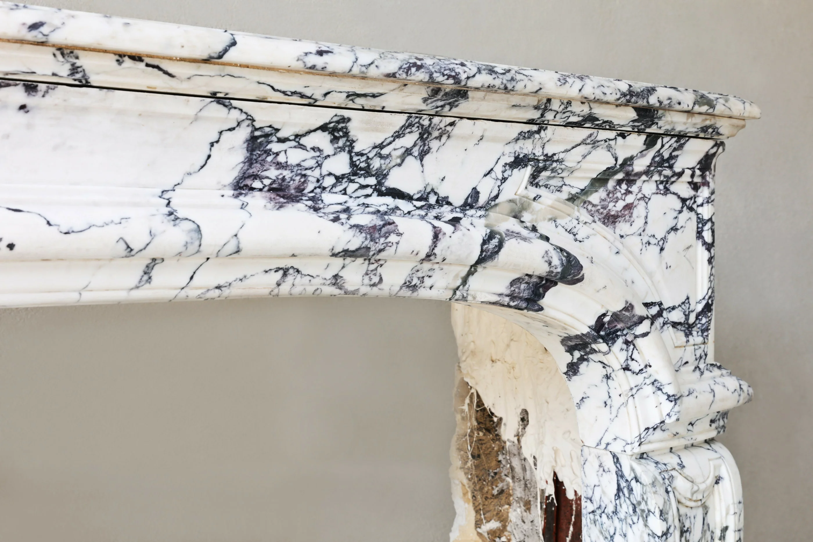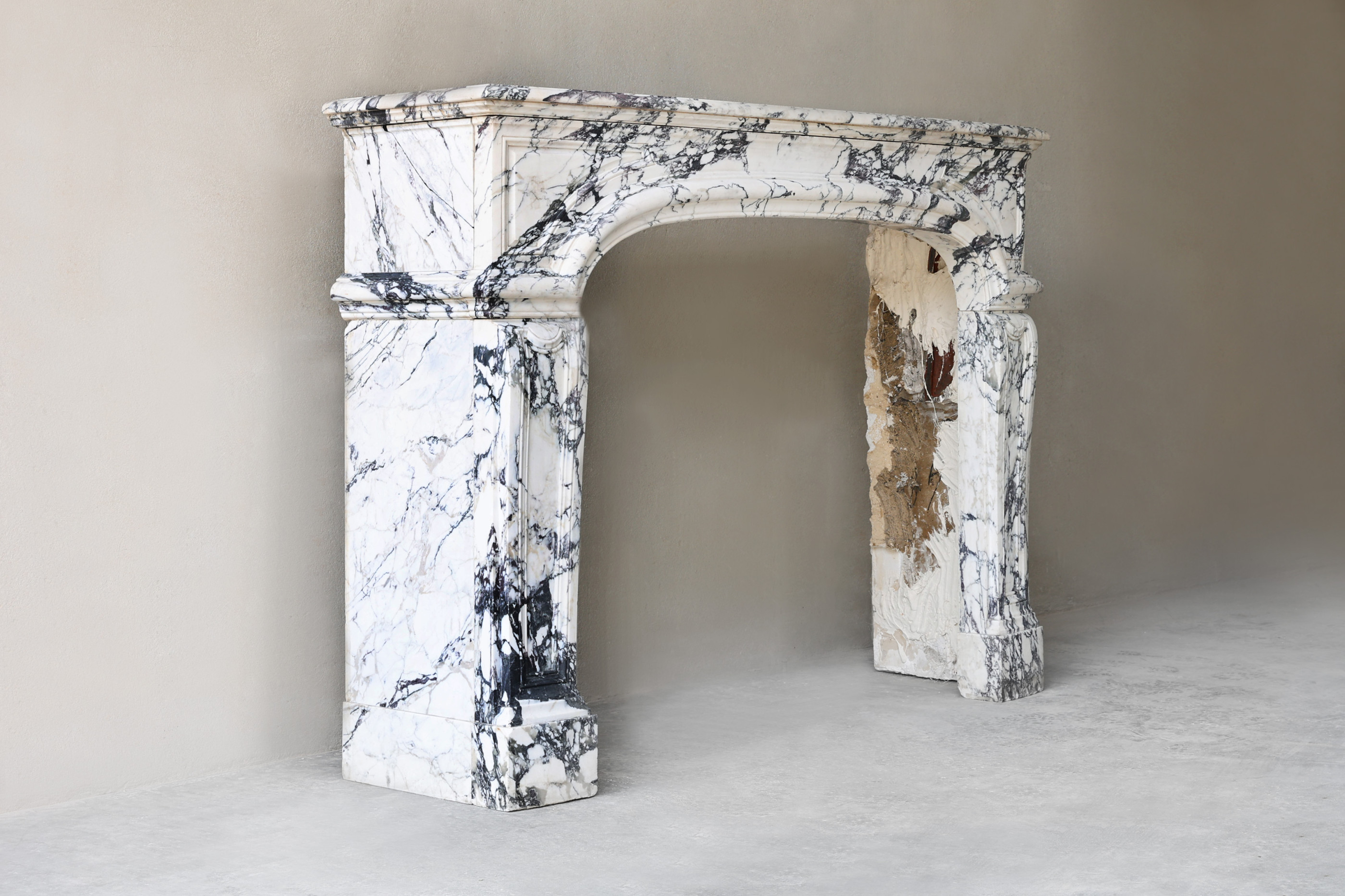 Louis XIV-schouwen staan bekend om hun symmetrische vormgeving en rijke ornamentiek. Deze schouwmantel vertoont verfijnde, met de hand gekapte details zoals sierlijke krulmotieven en klassieke bladornamenten, die getuigen van het hoogstaande vakmanschap van de 19e eeuw. De monumentale lijnen en proporties geven de haardmantel een tijdloze uitstraling, terwijl het unieke Paonazzo marmer elke schouw een eigen karakter geeft. Dankzij de originele elementen en subtiele slijtage heeft deze schoorsteenmantel een warme, doorleefde uitstraling die onmogelijk te evenaren is met moderne replica’s.
