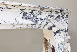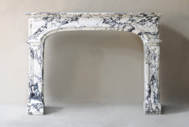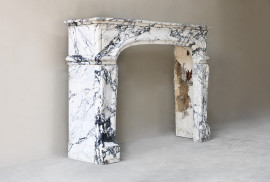 Louis XIV-schouwen staan bekend om hun symmetrische vormgeving en rijke ornamentiek. Deze schouwmantel vertoont verfijnde, met de hand gekapte details zoals sierlijke krulmotieven en klassieke bladornamenten, die getuigen van het hoogstaande vakmanschap van de 19e eeuw. De monumentale lijnen en proporties geven de haardmantel een tijdloze uitstraling, terwijl het unieke Paonazzo marmer elke schouw een eigen karakter geeft. Dankzij de originele elementen en subtiele slijtage heeft deze schoorsteenmantel een warme, doorleefde uitstraling die onmogelijk te evenaren is met moderne replica’s.