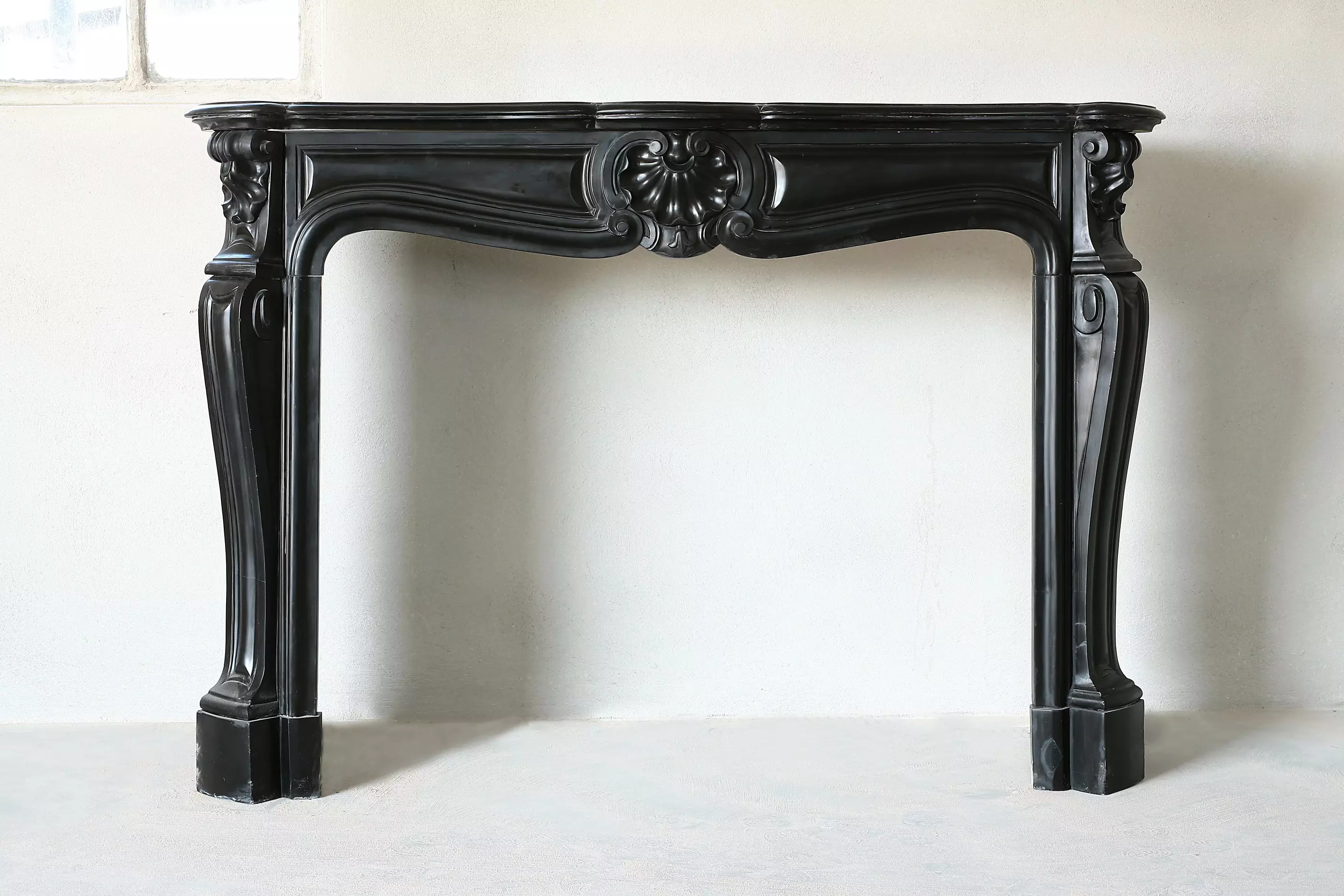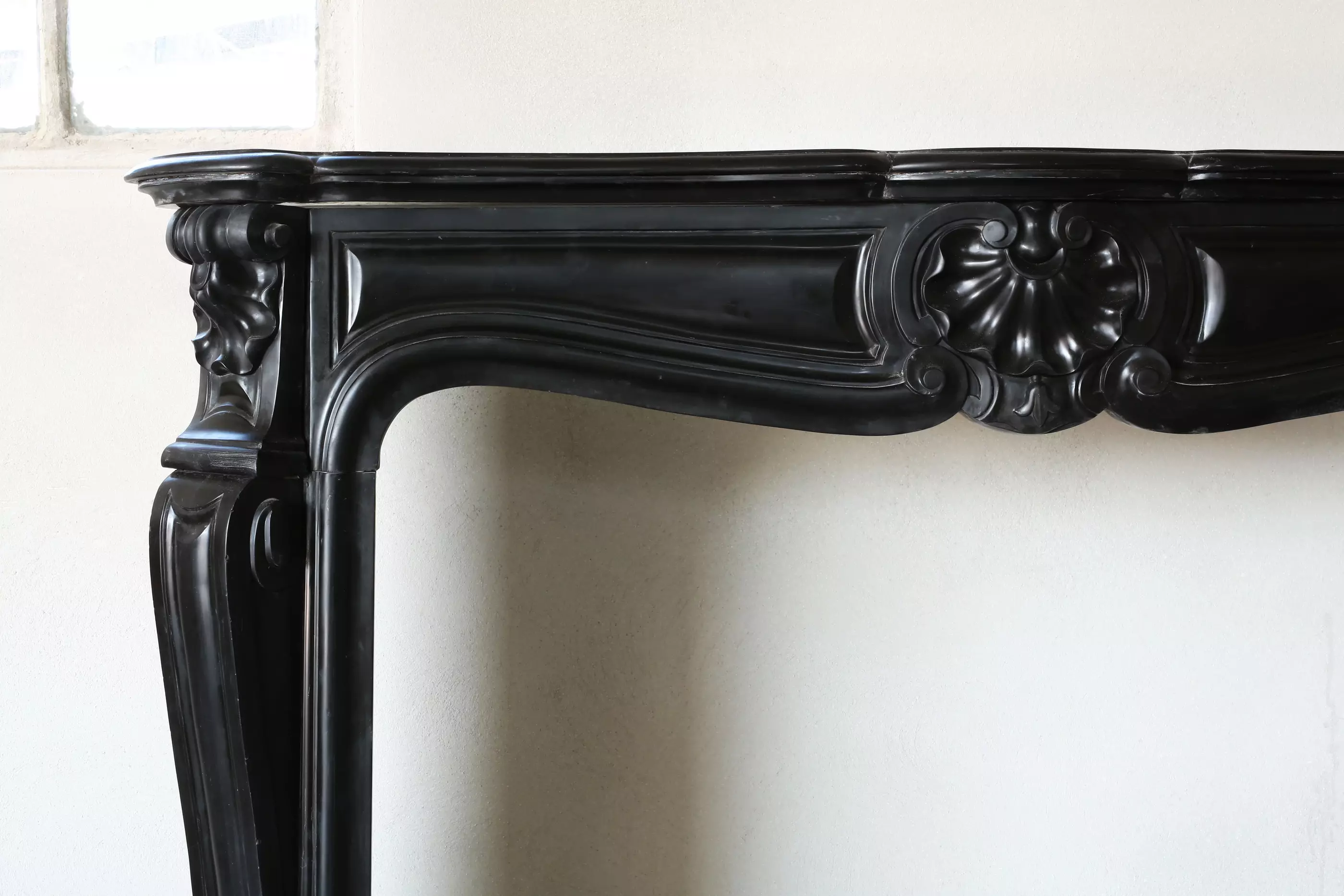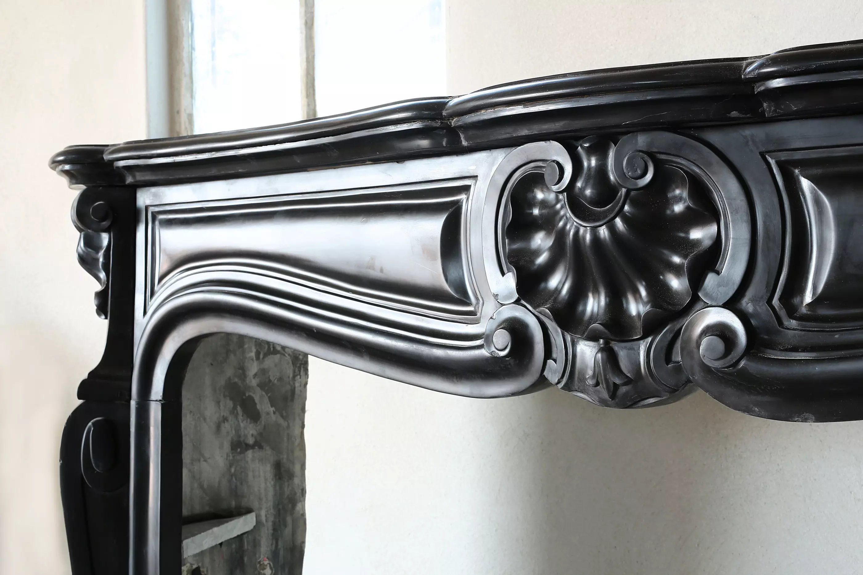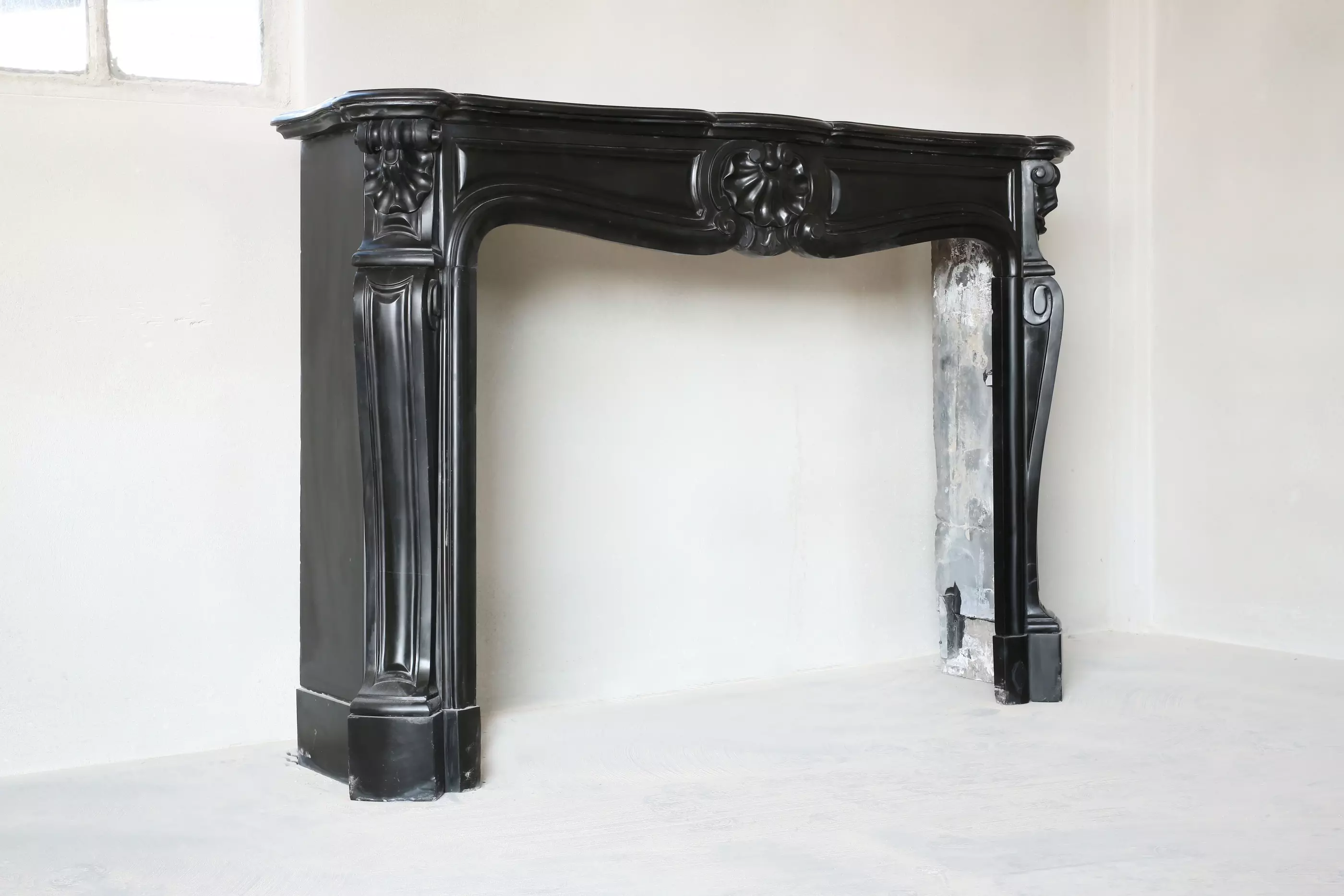 Werkelijk een hele fraaie antieke marmeren schouw uit het tijdperk van Lodewijk XV! Een echte Noir de Mazy (diepzwart) uit België. Deze prachtige schouw toont in elk interieur zeer fraai door zijn sierljke vorm en nostalgische uitstraling.